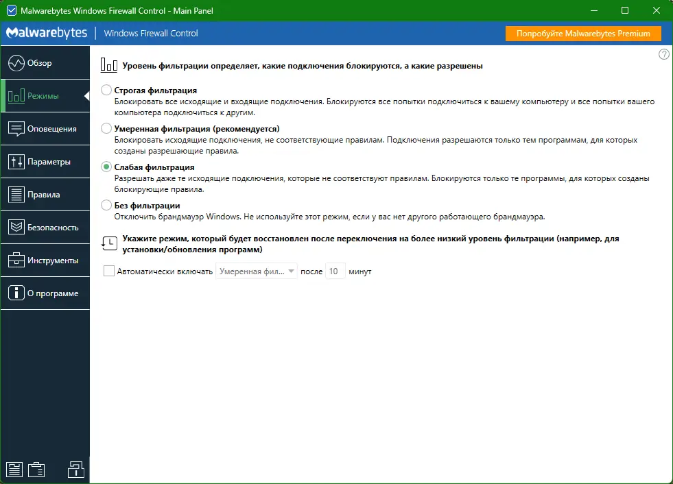 Malwarebytes Windows Firewall Control — это эффективное решение для дополнительной защиты компьютера от нежелательных сетевых подключений. В нем сочетается простота использования и расширенные возможности настройки, что делает его популярным среди пользователей, ценящих безопасность.