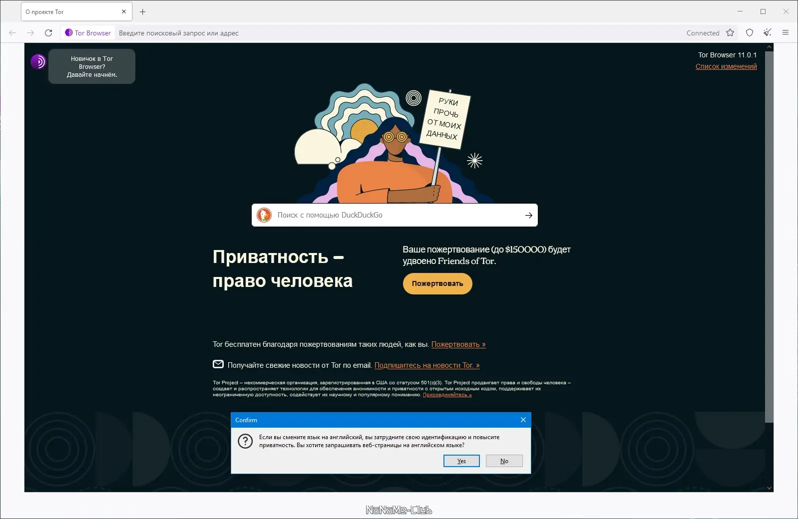 - Проверьте статус в правом нижнем углу — должно быть написано «Tor включен». Теперь можно безопасно пользоваться браузером для посещения сайтов.
