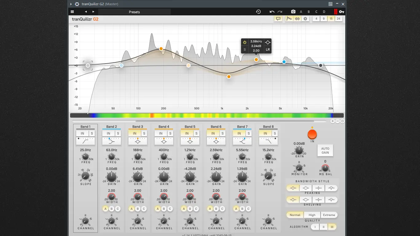 - Множество функциональных эквалайзеров, включая tranQuilizr и его улучшенную версию G2, обеспечивающих прозрачное звукообработку с широкой настройкой фильтров и частотных диапазонов.