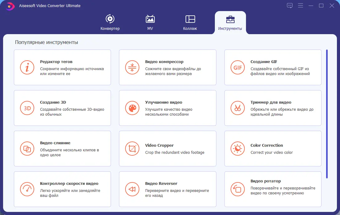 АISEESOFT Video Converter Ultimate — одна из лучших программ для загрузки, конвертирования и редактирования видеофайлов. Она позволяет преобразовывать DVD, видеофайлы и папки Blu-Ray в популярные форматы, а также создавать 3D видео. Программа умеет извлекать аудиодорожки и преобразовывать их в различные аудиоформаты. Встроенный видеоредактор обеспечивает настройку эффектов, обрезку, добавление водяных знаков и объединение нескольких файлов в один. Благодаря простому и понятному интерфейсу работа с программой становится удобной и быстрой.