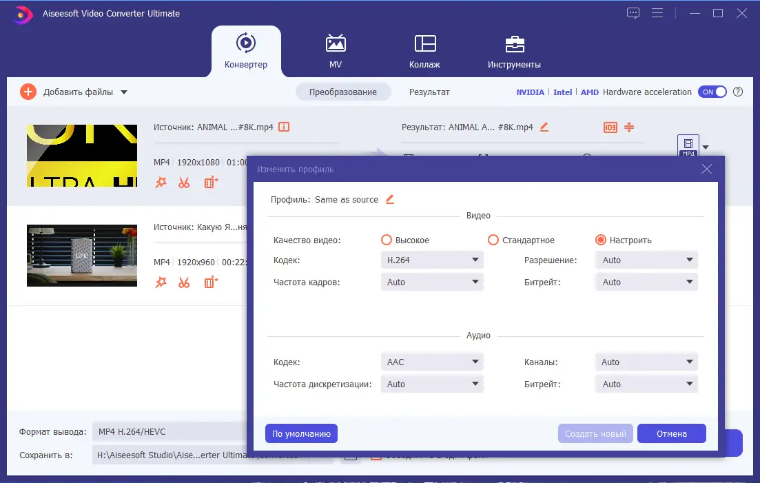 - Настройка параметров выходных файлов: разрешения, битрейта, частоты кадров, аудио каналов;