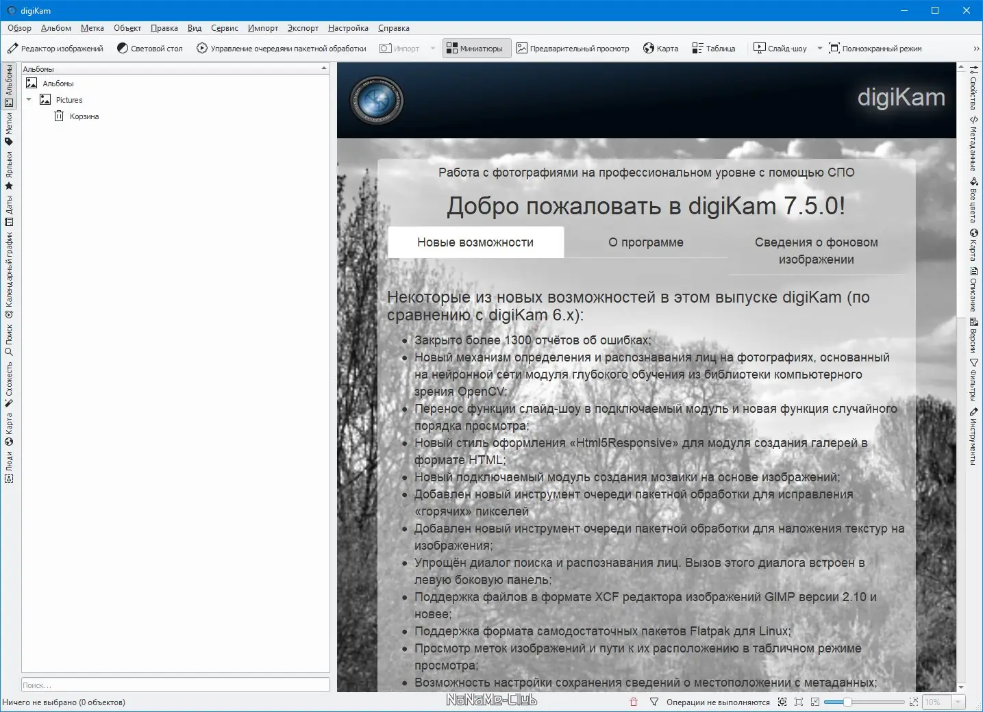 Настоящая программа — digiKam — представляет собой мощный фото-менеджер для Windows, разработанный для обработки и организации цифровых фотографий и видео. Она поддерживает импорт файлов напрямую с фотоаппаратов и внешних устройств, таких как SD-карты и USB-накопители, а также работает с форматом RAW. Одна из ключевых особенностей — автоматическая каталогизация по различным критериям, например, по дате. В интерфейсе доступны добавление тегов, выставление оценок и пометок, что значительно облегчает поиск и выбор нужных файлов по тегам, рейтингу, метаданным или локации. Также реализована возможность просмотра альбомов на карте на основе геолокационных данных. Программа совместима с Windows всех актуальных редакций и полностью на русском языке.