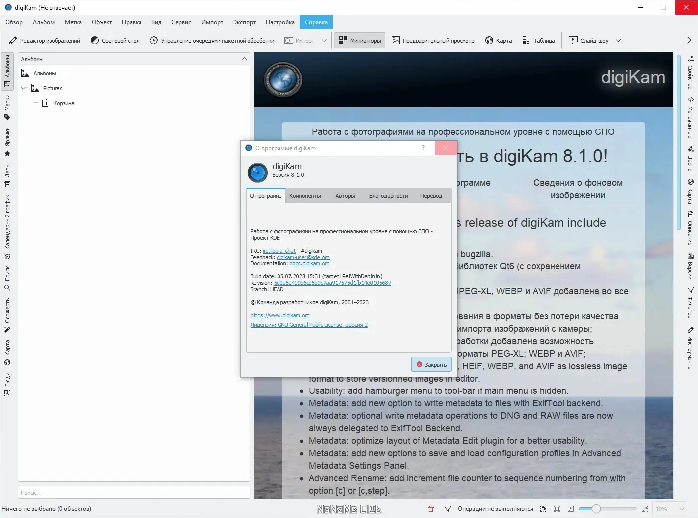 Дополнительно | Потребуется библиотека Exiv2 и LibRaw для работы с метаданными и RAW файлами |