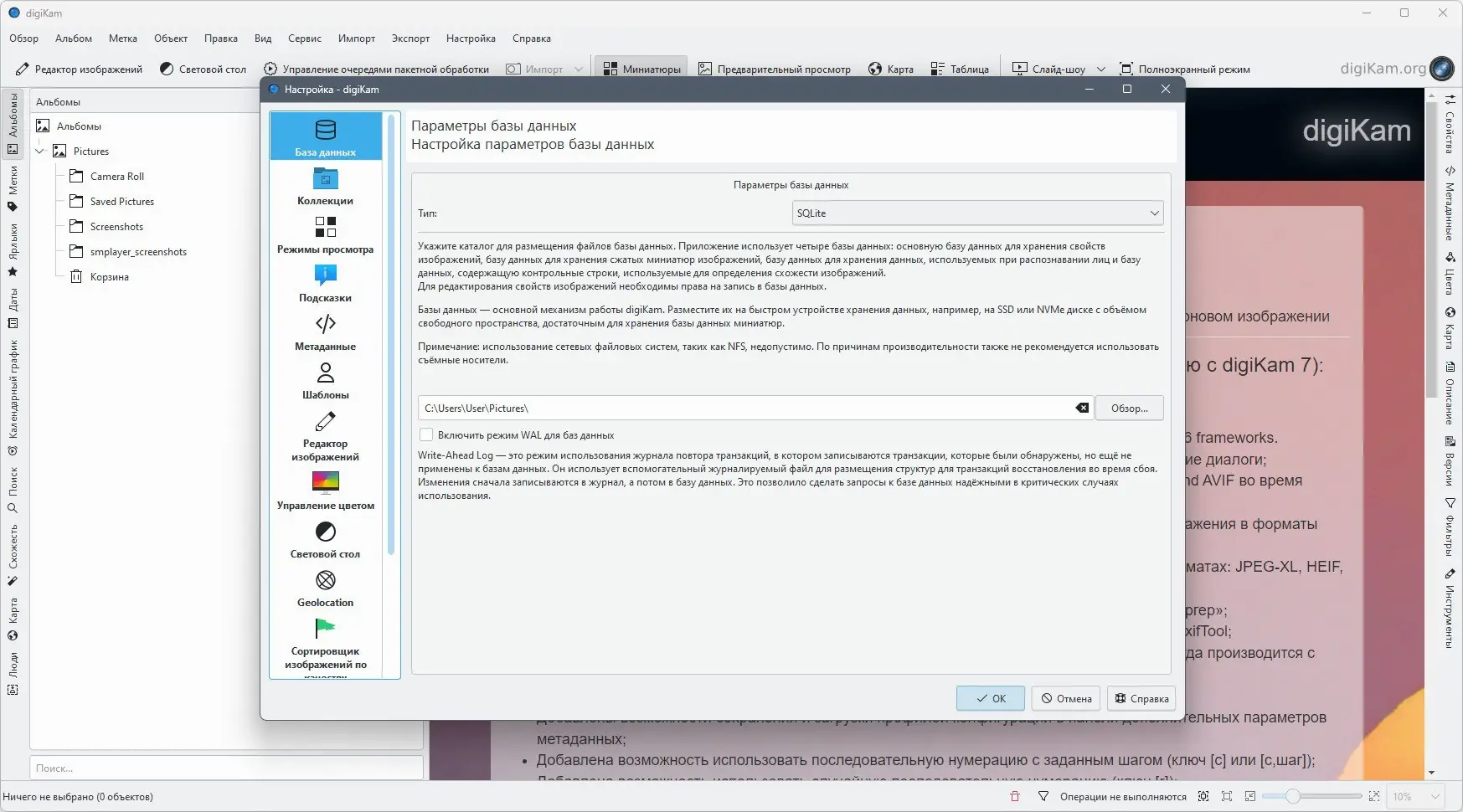- При первом запуске выполнить настройку директории хранения фотографий и базы данных
