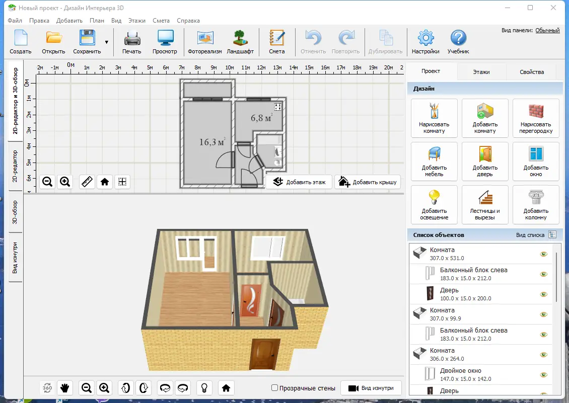 - Удобная планировка квартиры с возможностью быстрого редактирования и автоматической проверки пропорций.