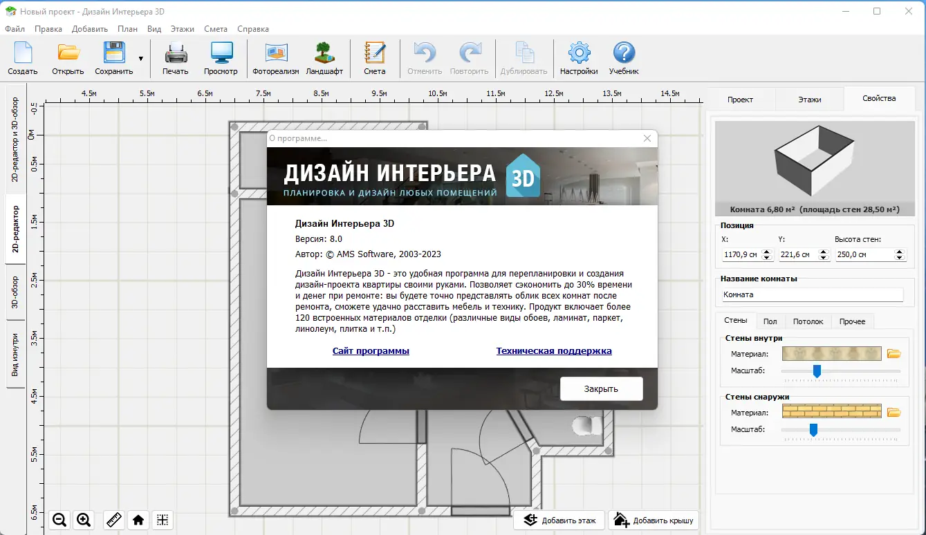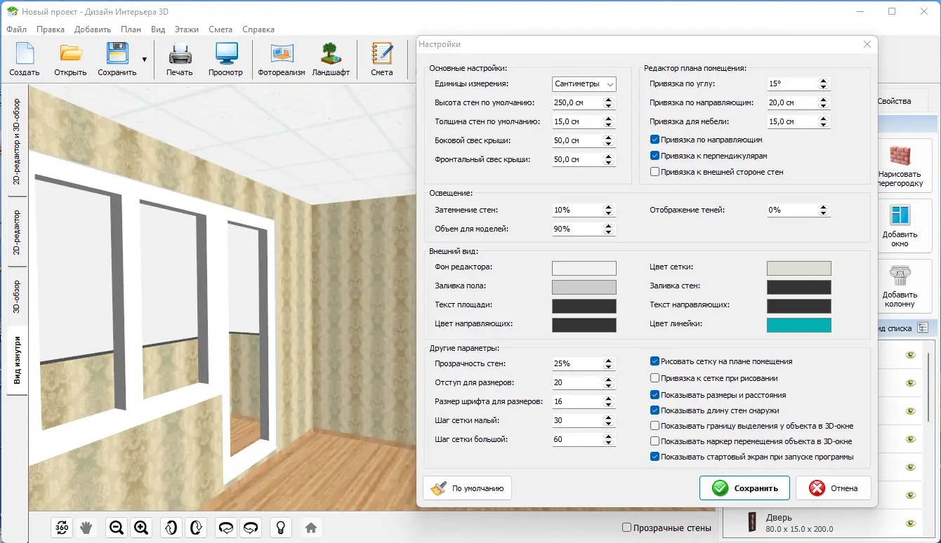 «Дизайн Интерьера 3D» — это удобная программа для перепланировки и создания дизайн-проекта квартиры своими руками. Позволяет сэкономить до 30% времени и денег при ремонте, обеспечивая точное представление об облике комнат после ремонта, а также возможность удачно расставить мебель и технику. В комплект входит более 450 встроенных материалов отделки, таких как обои, ламинат, паркет, линолеум и плитка.