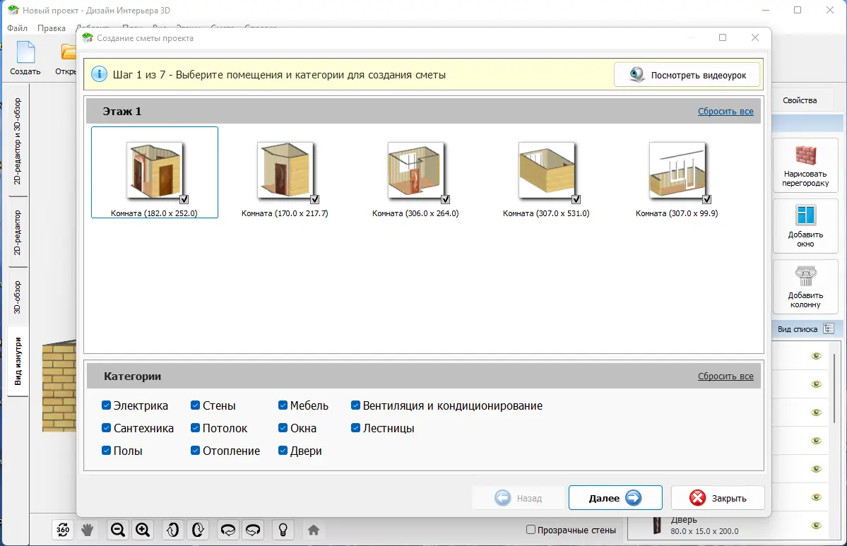 - Богатый каталог отделочных материалов и мебели, включающий более 450 позиций.