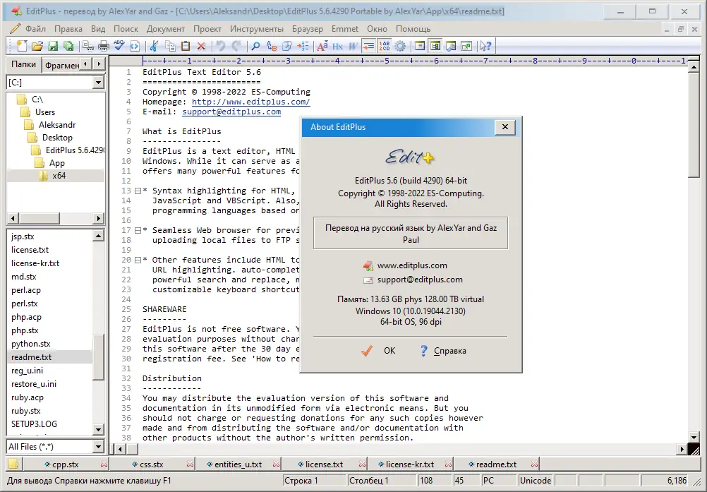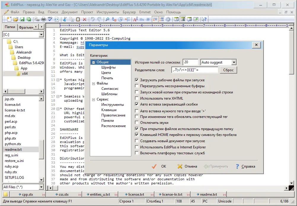Современные возможности включают поддержку регулярных выражений в поиске и замене, системы шаблонов, встроенных клипов, автоматического завершения вводимых фрагментов, настройку горячих клавиш, отображение непечатаемых символов и возможность загрузки дополнительных файлов подсветки синтаксиса. Также программа позволяет управлять файлами через встроенные команды FTP, быстро вставлять HTML-теги с помощью панели инструментов и легко переключаться между открытыми документами. Плюсом является интегрированный браузер и возможность использования пользовательских панелей, что делает редактор универсальным инструментом для веб-разработки и редактирования текстов.