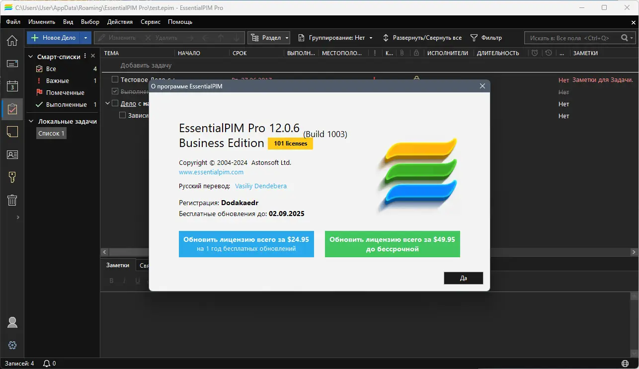 EssentialPIM — мощный и функциональный почтовый клиент и органайзер, который предлагает интеграцию со всеми основными онлайн-сервисами. Это отмеченное наградами решение предназначено для повышения вашей производительности и удобства работы с данными. Приложение пользуется популярностью среди пользователей благодаря интуитивному интерфейсу, широкому набору настроек и высокой персонализации. EssentialPIM Pro расширяет возможности стандартной версии и включает дополнительные функции, необходимые для деловых и личных задач, таких как управление электронными письмами, встречами, списками дел, заметками, контактами и паролями. Благодаря поддержке базы данных с открытым исходным кодом и возможностям синхронизации с облачными сервисами, программа становится надежным и гибким инструментом для ежедневной работы и совместного использования информации.