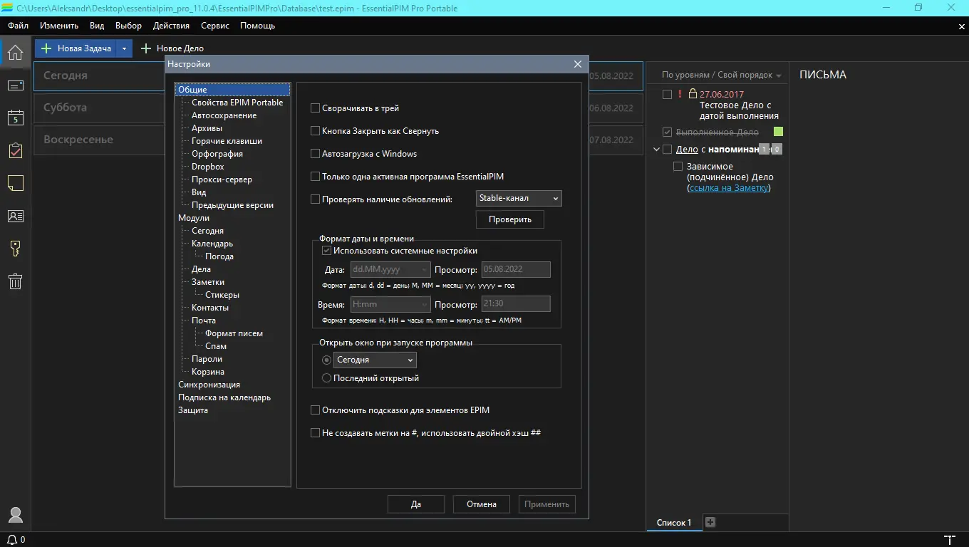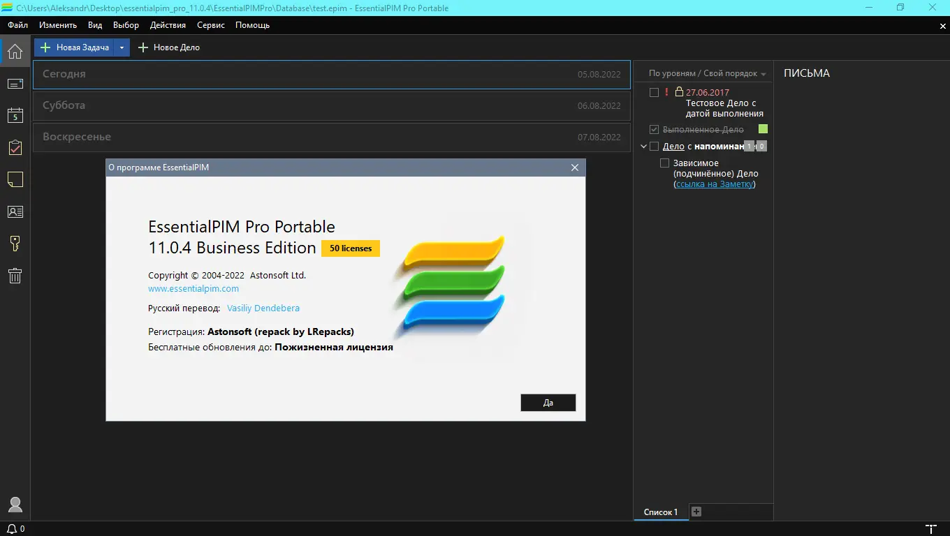 EssentialPIM — это высокофункциональный менеджер, предназначенный для эффективного управления личными и рабочими данными. Программа поддерживает работу с календарем, списками задач, заметками и контактами, обеспечивая возможность импорта и экспорта информации, печати и синхронизации с популярными сервисами и устройствами. Благодаря поддержке 128-битного шифрования и интеграции с Outlook, Windows Mobile, PalmOS, программа гарантирует безопасность и совместимость с существующими системами. Удобная портативная версия позволяет запускать EssentialPIM с USB-носителя, а расширенные функции поиска и настройки делают работу максимально комфортной для пользователя.
