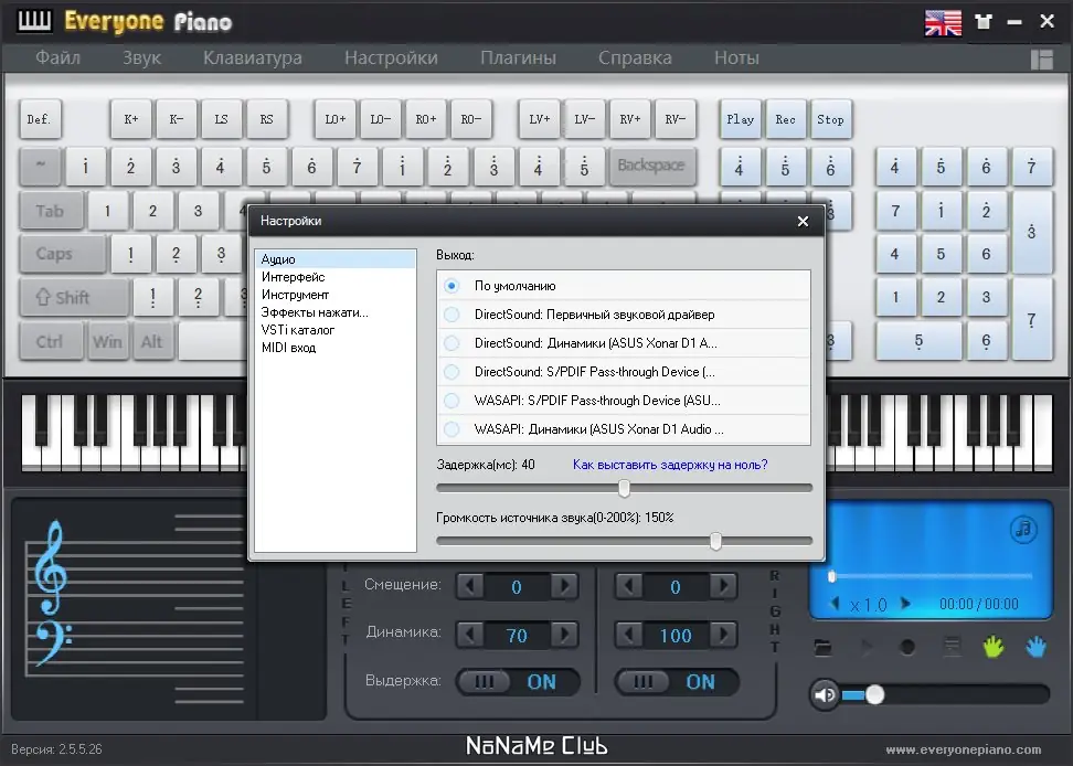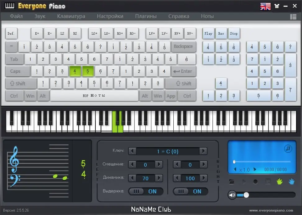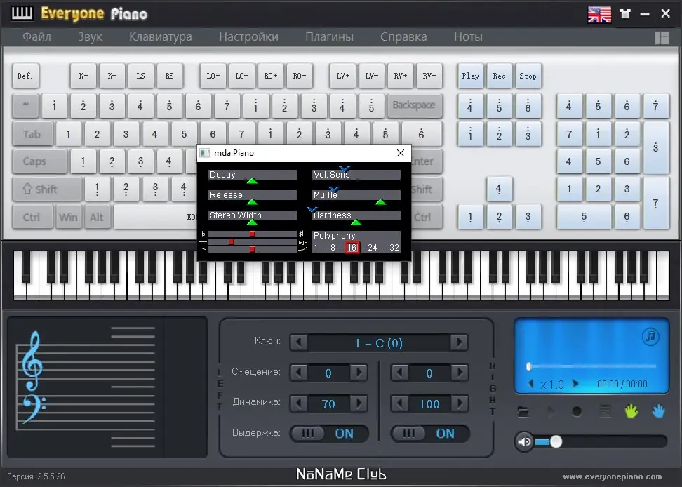 - Поддержка игры в 2 руки через клавиатуру компьютера и подключение внешних MIDI клавишных.