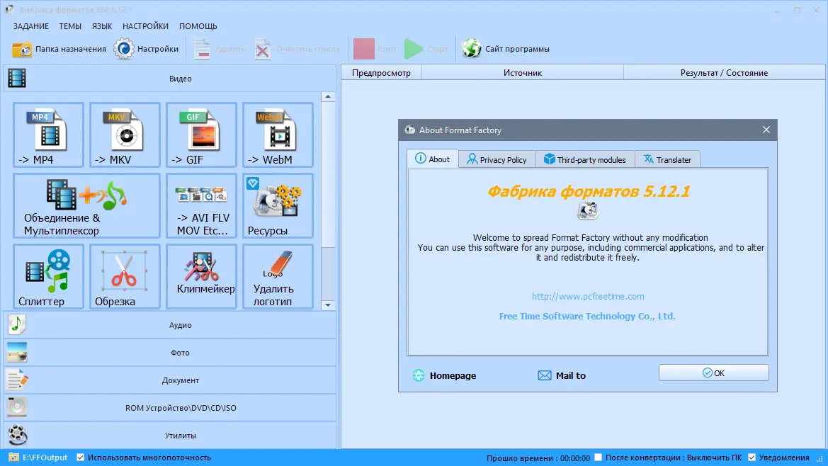 Format Factory — многофункциональный конвертер мультимедиа, который объединяет в себе инструменты для преобразования видео, аудио, изображений и документов. Благодаря поддержке широкого спектра форматов, он идеально подходит для работы с файлами разных типов и устройств. Программа обладает дополнительными возможностями, такими как восстановление поврежденных файлов, изменение размеров и вращение изображений, а также пакетное выполнение задач, что делает её универсальным решением для пользователей, ищущих бесплатный и удобный инструмент.