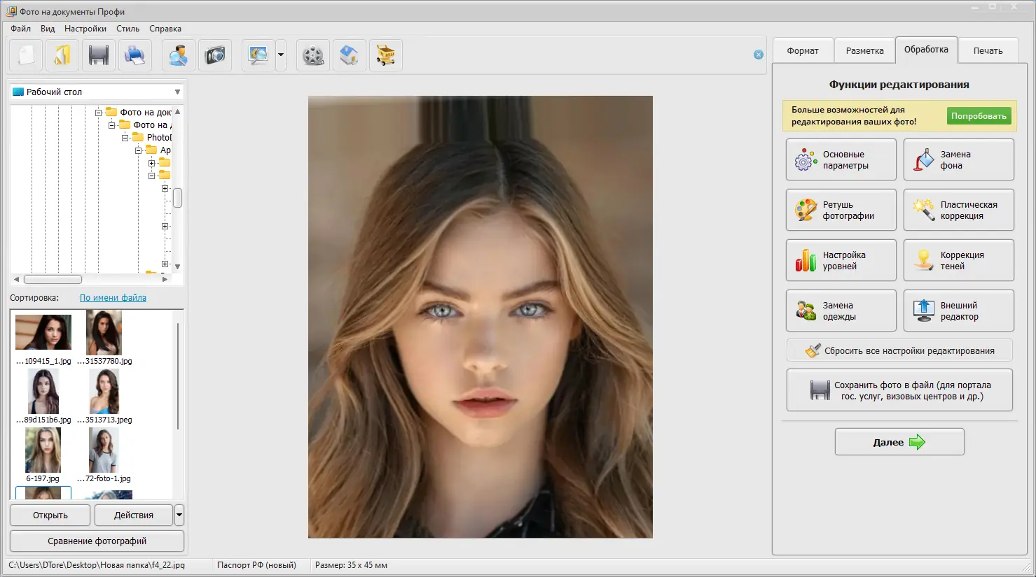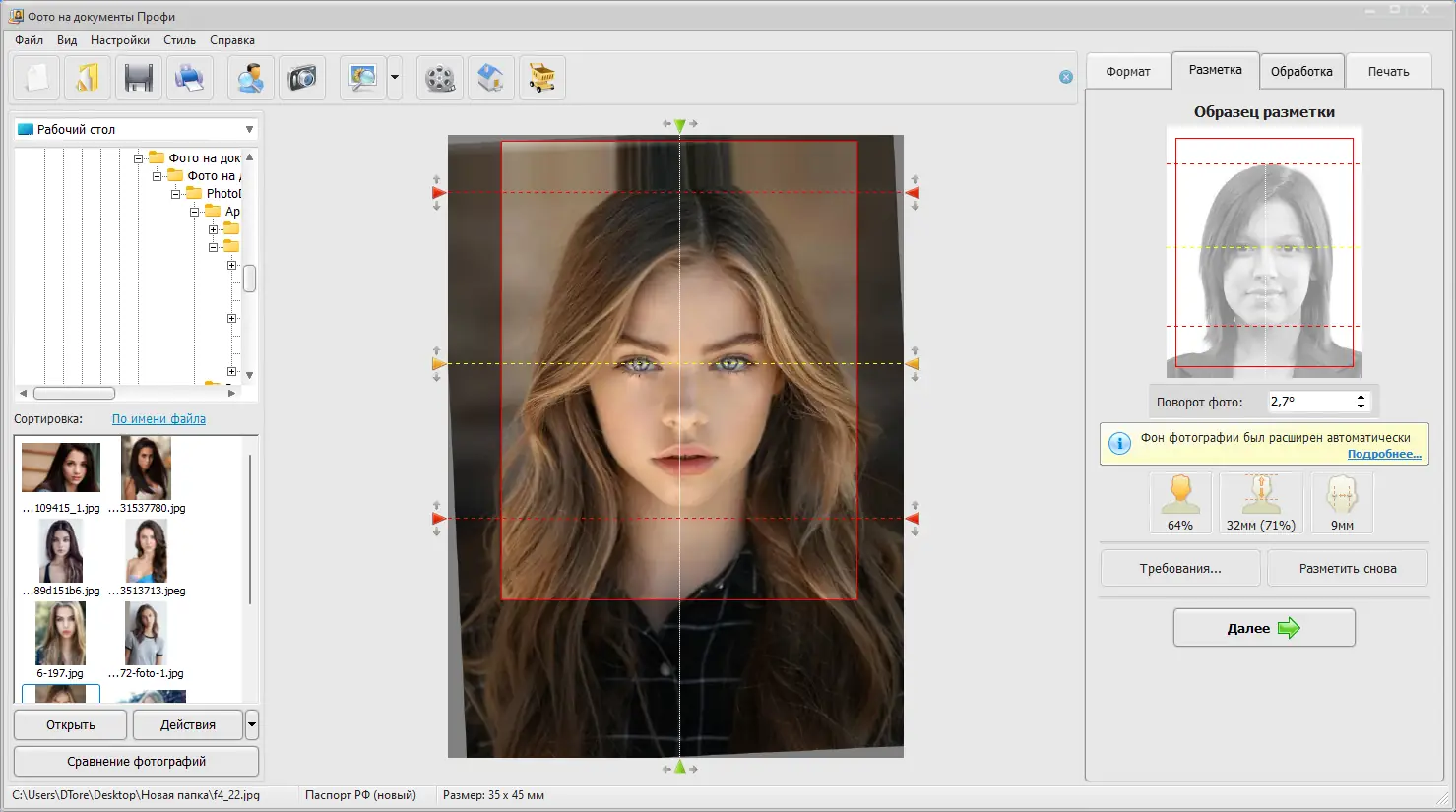 Данная программа предназначена для профессиональной подготовки фотографий на документы с простым и интуитивно понятным интерфейсом. Внутри программы доступны все необходимые форматы: стандартные 3×4, а также фотографии для паспортов, виз и удостоверений различных стран мира. Встроенные функции позволяют не только выбрать подходящий формат, но и провести автоматическую или ручную замену фона, добавить или изменить одежду на фото, выполнить калибровку монитора и подготовить макеты для эффективной распечатки. Программа обеспечивает высокое качество изображений благодаря поддержке растушёвки и точной разметки лица.