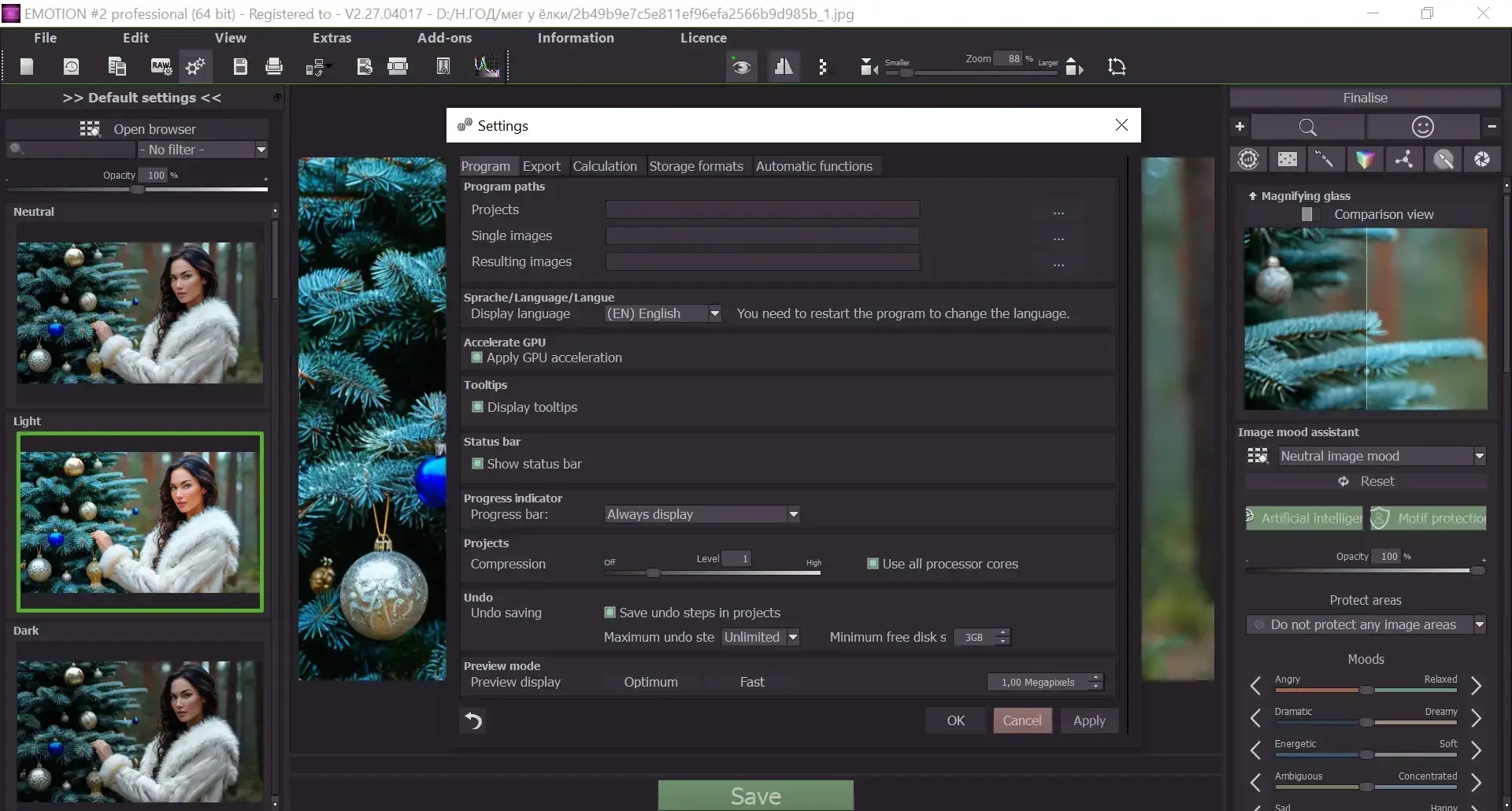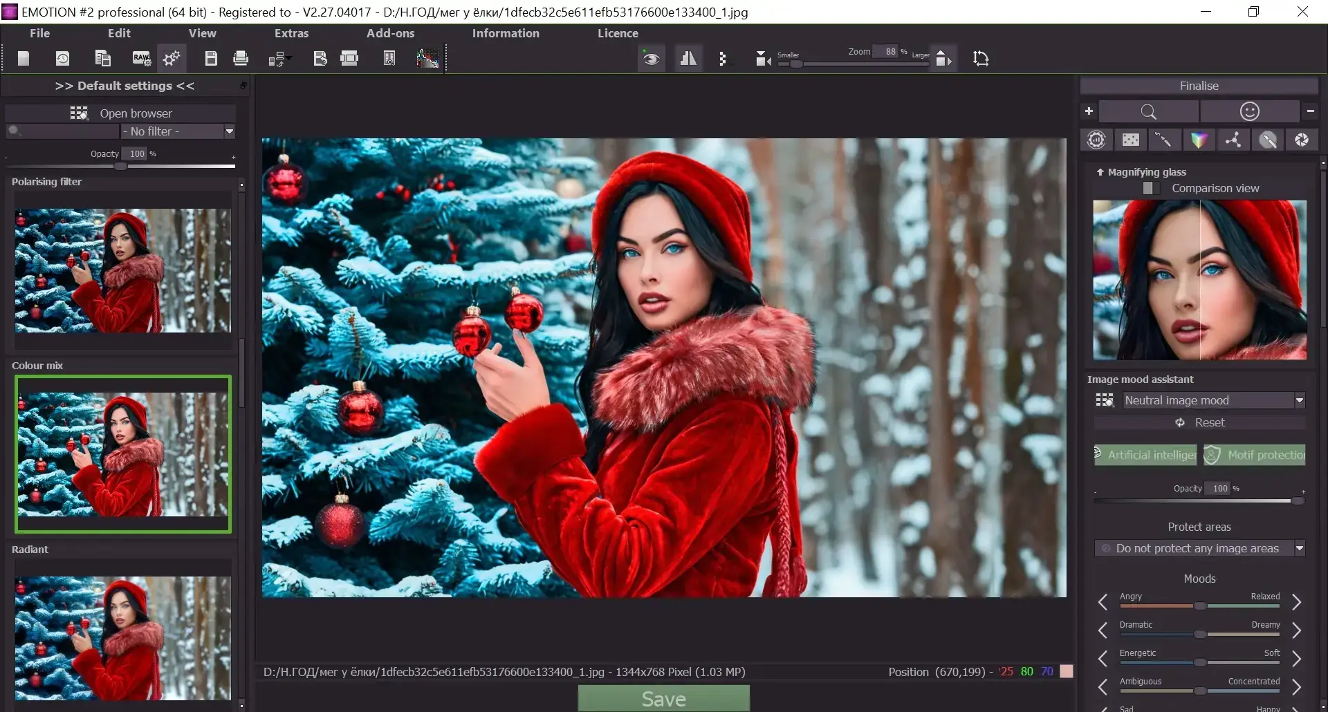 Это универсальное решение для тех, кто хочет не только повысить качество своих снимков, но и придать им особую атмосферу с помощью уникальных функций. Franzis EMOTION позволяет легко управлять настроением изображений, изменять выражение лиц, добавлять эффекты и фильтры, а также корректировать цвета, контрастность и другие параметры. Поддержка форматов JPEG, PNG, TIFF, RAW обеспечивает работу с фотографиями любого качества и типа.