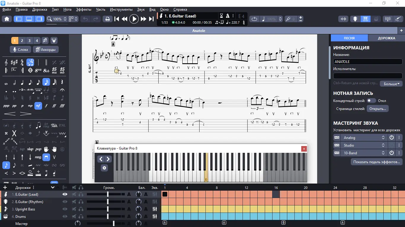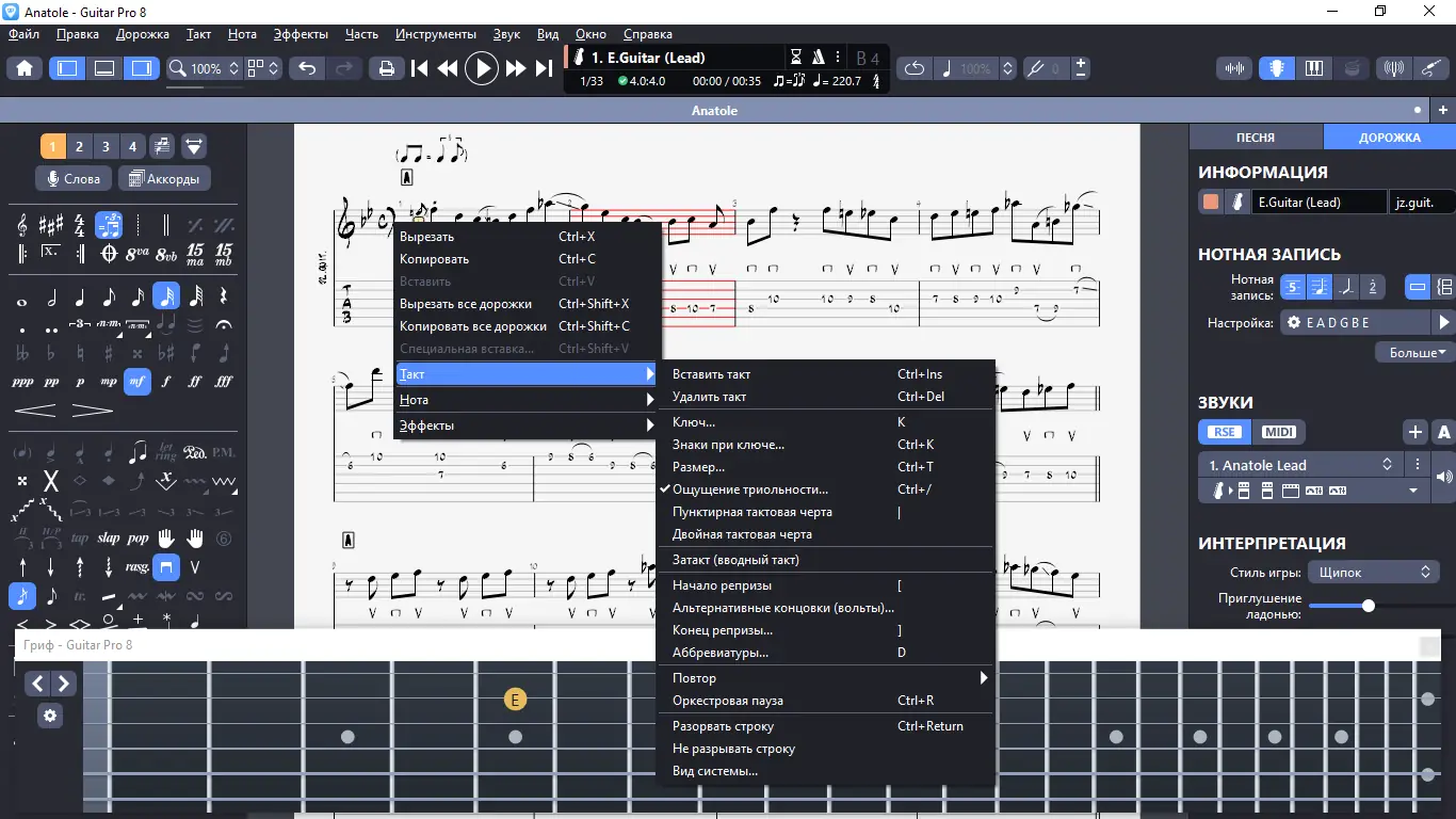 - Создание и редактирование гитарных табулатур и нотных партий.