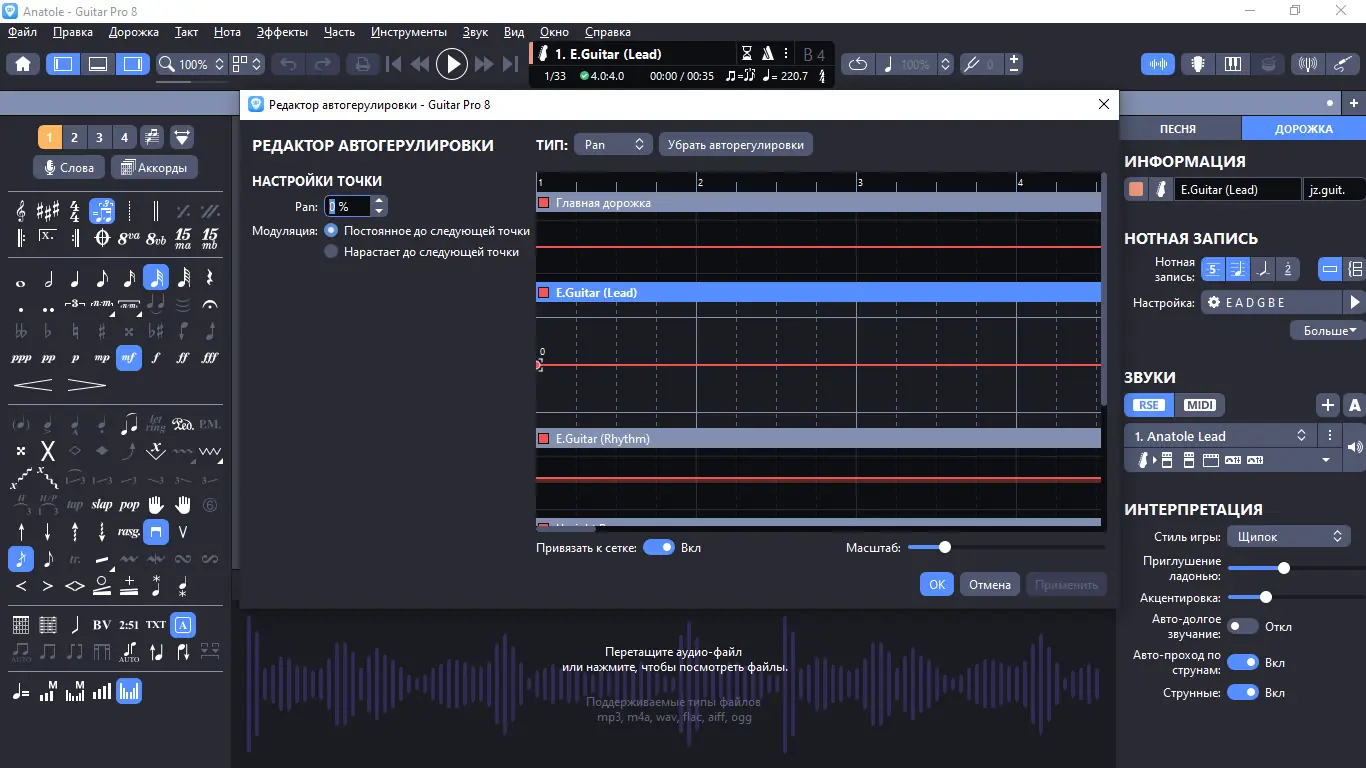 Guitar Pro — мощный редактор нот и табулатур, предназначенный для гитаристов, басистов и музыкантов, работающих с различными инструментами. Она обеспечивает создание, точное редактирование и воспроизведение музыкальных произведений, а также включает встроенный MIDI-редактор, построитель аккордов, проигрыватель и метроном. Программа поддерживает редактирование партитур для гитары, баса, гавайской гитары, а также создание минусовок для ударных и фортепиано. Это один из наиболее удобных инструментов для тех, кто хочет улучшить свои навыки, сочинять музыку или просто подыгрывать.