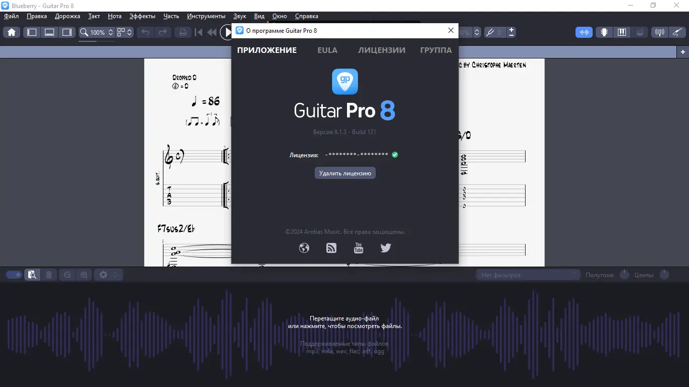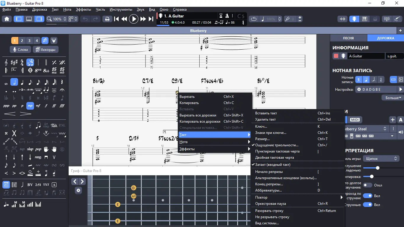 Guitar Pro — это профессиональный нотный редактор, предназначенный для работы с гитарными, басовыми и гавайскими гитарами, а также для создания минусовок для ударных и фортепиано. Программа обладает богатым набором инструментов для редактирования и проигрывания музыки, среди которых встроенный MIDI-редактор, построитель аккордов и метроном. В версии 8 реализованы новые функции, приближающие редактор к современным Digital Audio Workstation (DAW), такие как отдельные аудиодорожки, эффекты педалей, визуальный метроном и инструменты для практики.