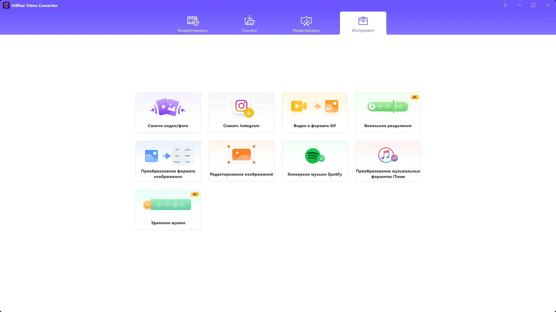 HitPaw Video Converter позволяет пользователям без труда преобразовывать мультимедийные файлы, а также загружать видео и аудио с более чем 1000 веб-сайтов одним щелчком. Благодаря интуитивному интерфейсу и мощным функциям редактирования вы можете вырезать, объединять или настраивать ваши видео по своему усмотрению. Программа поддерживает более 500 видеоформатов и 300 аудиоформатов, а также обеспечивает преобразование с минимальными затратами времени—в 60 раз быстрее традиционных решений, без потери качества.