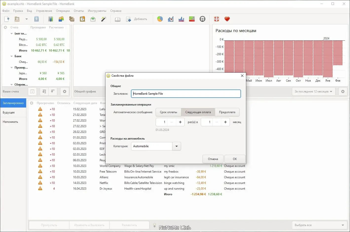 HomeBank поддерживает различные типы счетов — наличные, банковские, инвестиционные и кредитные, что позволяет вести учёт в реальном времени, указывая начальный баланс, номер счета и наименование банка. Автоматическая генерация графиков помогает видеть, как расходуются деньги, выявлять повторные операции и контролировать приходы и расходы по категориям. Это важный инструмент для полного анализа финансовых потоков и повышения финансовой дисциплины.
