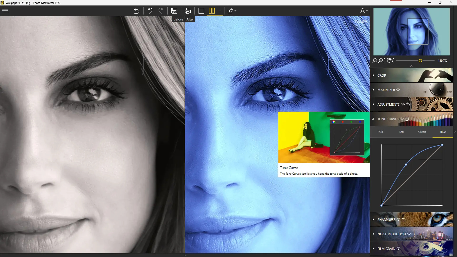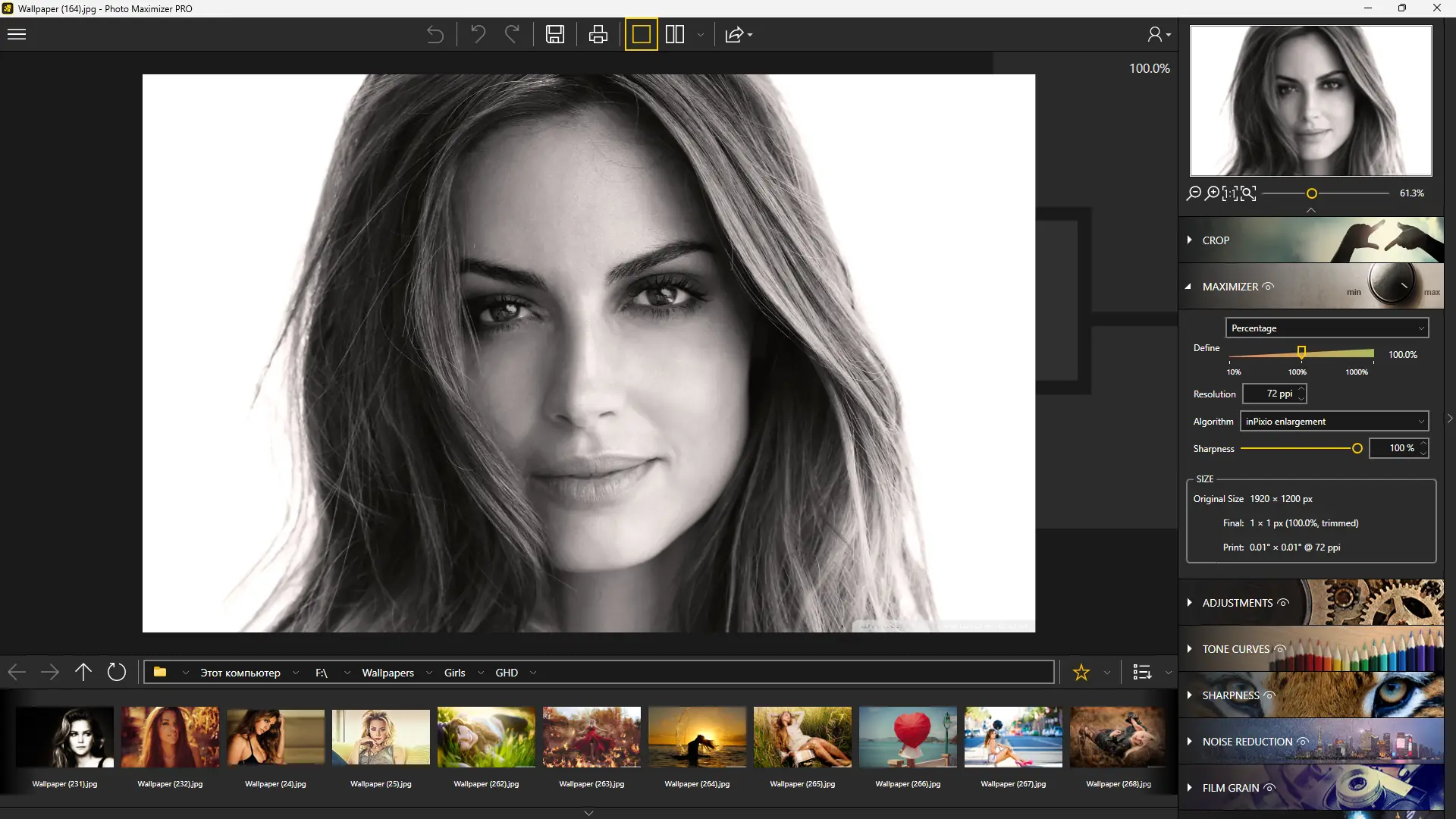 Данная программа предназначена для профессионального и любительского использования, обеспечивая высокое качество увеличения изображений. InPixio Photo Maximizer позволяет пользователю увеличивать масштаб фотографий до 1000% и сохранять их в исходном лучшее качестве. Встроенное окно предварительного просмотра дает возможность просматривать результат и подбирать оптимальные настройки перед финальным сохранением. Кроме того, графический редактор способен оптимизировать качество и контрастность изображений, удалять артефакты и шумы, что особенно важно при работе с JPEG-файлами. Плюсом стоит отметить поддержку пакетной обработки и использование современных алгоритмов масштабирования, что ускоряет рабочий процесс.