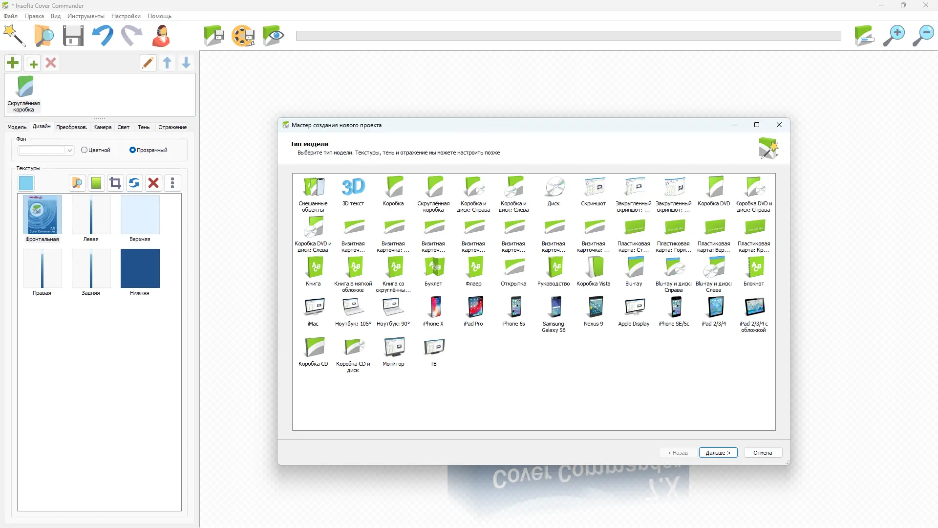 Insofta Cover Commander позволяет создавать качественные 3D модели упаковок, книг, дисков, руководств и иных продуктов благодаря простому интерфейсу и широкому набору настроек. В программе доступны многочисленные предварительные шаблоны и модели, а также возможность комбинировать различные объекты для достижения уникального дизайна. Поддержка исчерпывающих настроек освещения, камеры, теней и отражений дает возможность добиться любых визуальных эффектов и видеть результат в реальном времени в окне предпросмотра. Мастер создания проекта автоматизирует издержки ручной работы, чтобы вы могли сосредоточиться на содержании вашего дизайна.