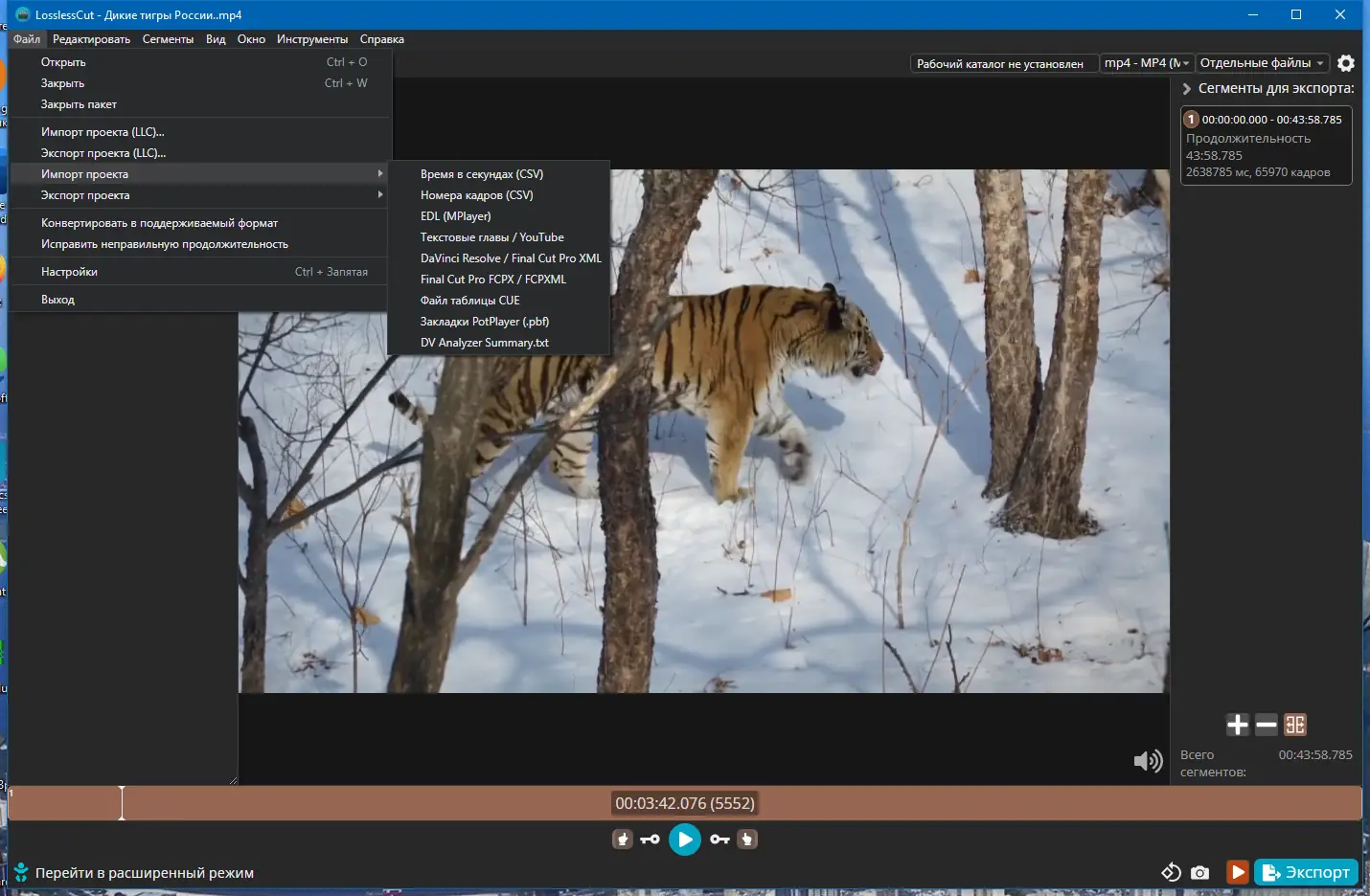 LosslessCut — это легкий и быстрый видеоредактор для точной нарезки мультимедийных файлов без потерь качества. Он позволяет мгновенно удалять ненужные фрагменты, делая слияние сегментов и работающие с файлами одинакового кодека, без перекодирования и дополнительных задержек.