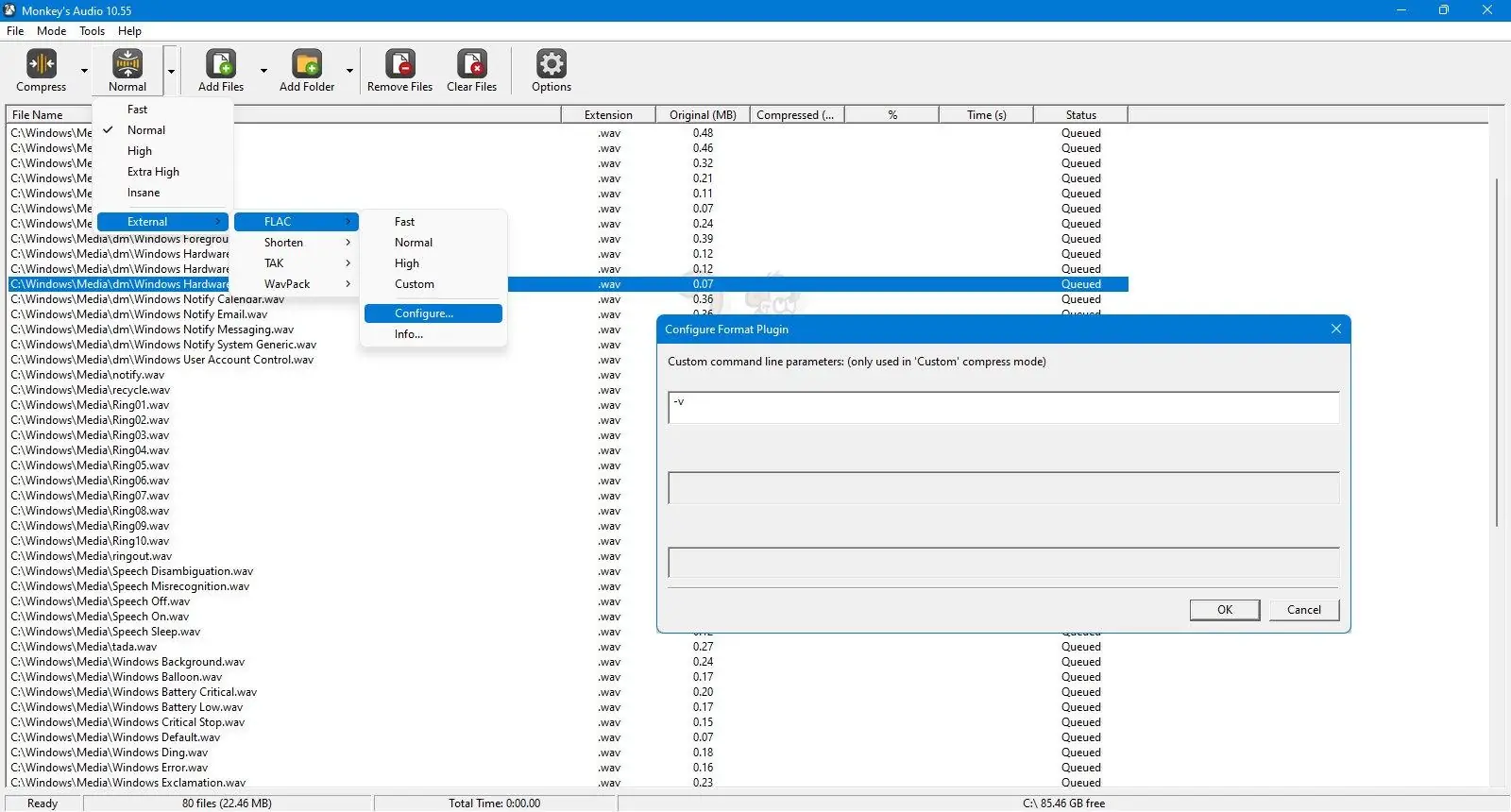 - Конвертация в дополнительные форматы: Rkau, Wavpack и Shorten, а также использование внешних кодировщиков MP3 (MP3Enc и Lame), MP+ и OGG.