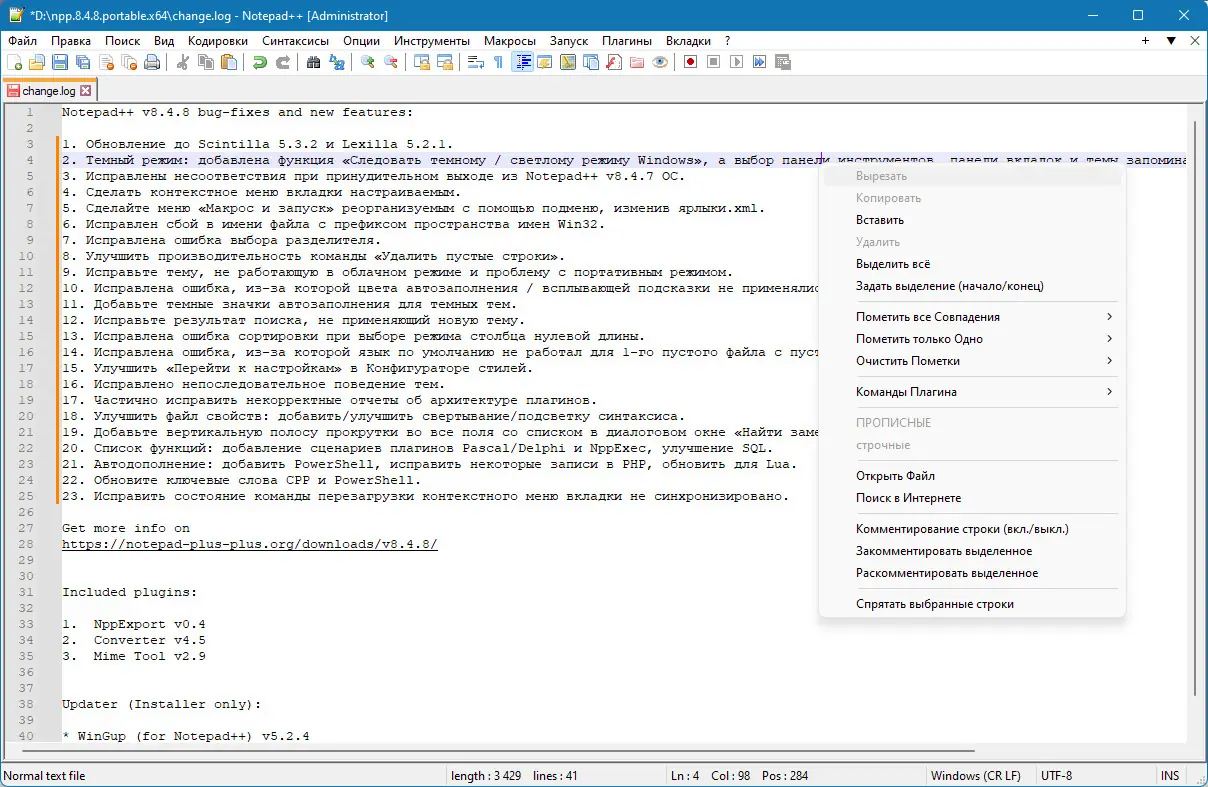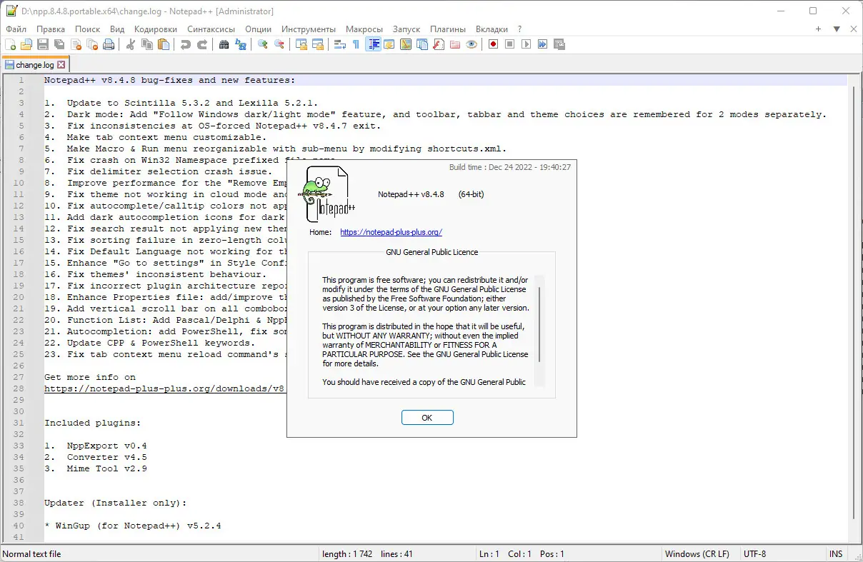 Notepad++ — это мощный бесплатный редактор, предназначенный для работы в операционной системе MS Windows. Он значительно превосходит стандартный Блокнот благодаря поддержке подсветки синтаксиса для множества языков, функции сворачивания блоков, автоматического завершения слов и другим инструментам. В основе программы лежит компонент Scintilla, написанный на C++ с использованием Win32 API и STL, что обеспечивает высокую производительность и минимальный размер файла. Распространяется под лицензией GPL, что гарантирует свободное использование и модификацию.