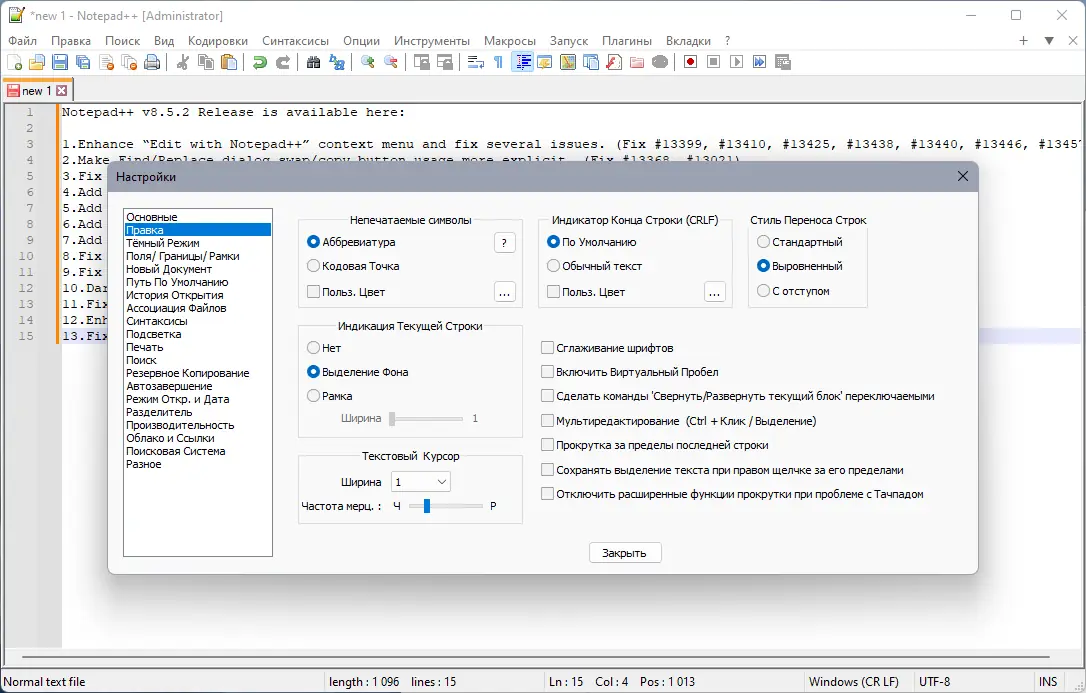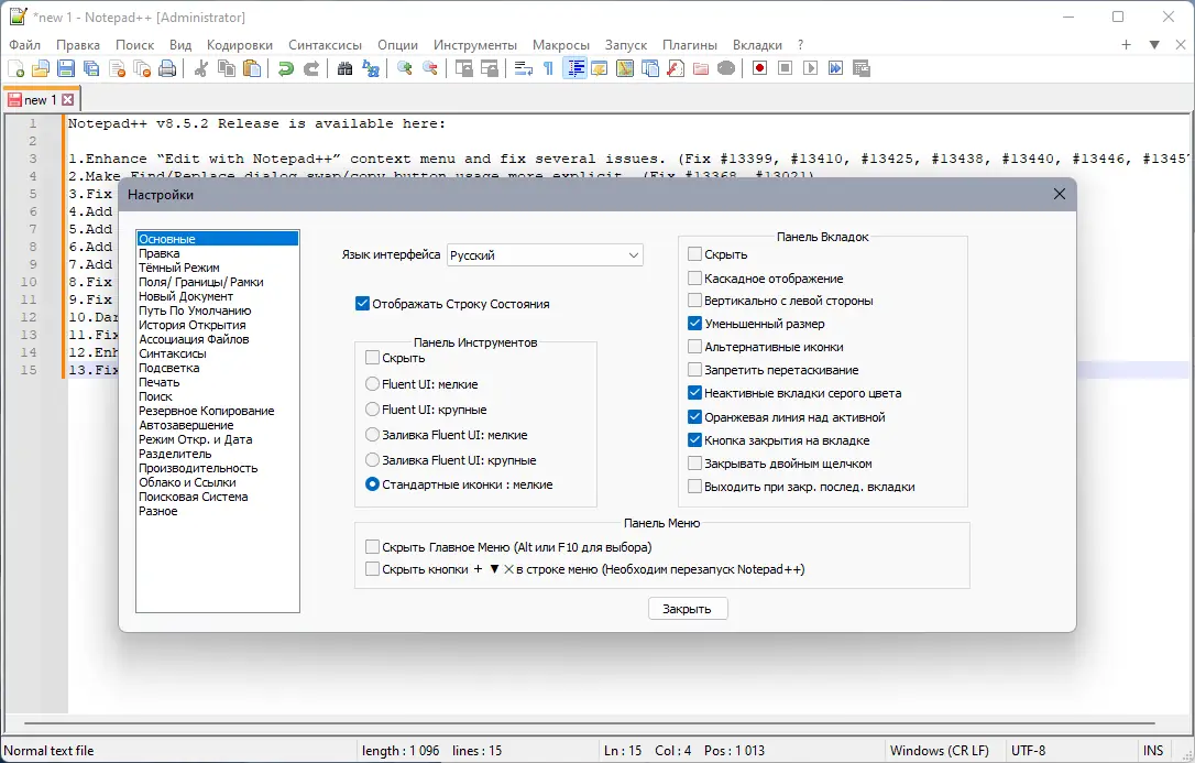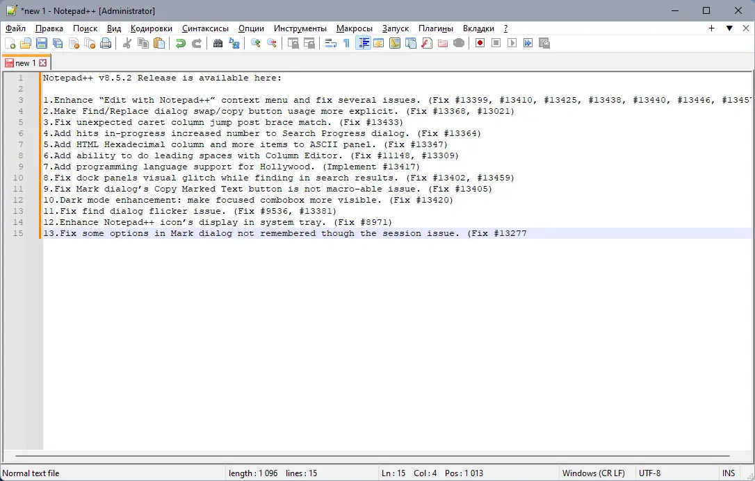 Обновленная версия включает улучшенную поддержку языков, расширенные возможности подсветки и автоматического определения состояния файлов, а также более стабильную работу с большими документами. В разделе «Changelog» можно ознакомиться с полным списком изменений и новых функций.
