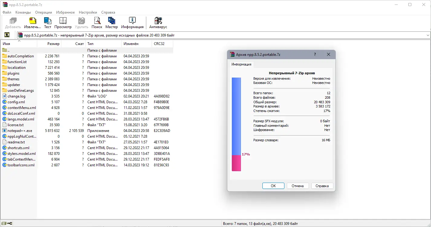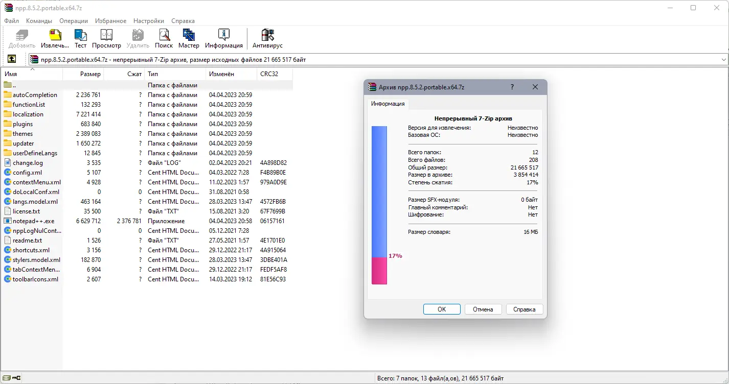 Портативная версия программы представлена разработчиком и не требует установки на компьютер. Она включена в комплект в виде архивов с высоким уровнем сжатия и совместима с различными версиями Windows, 32 и 64 бит. Файлы: npp.8.5.2.portable.x64.7z и npp.8.5.2.portable.7z позволят использовать редактор на любом устройстве без необходимости внесения изменений в систему.
