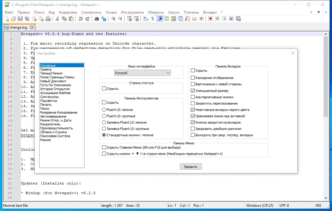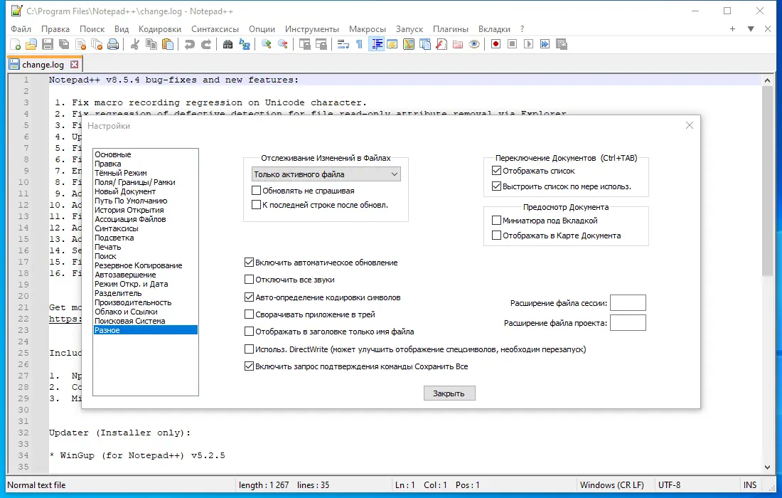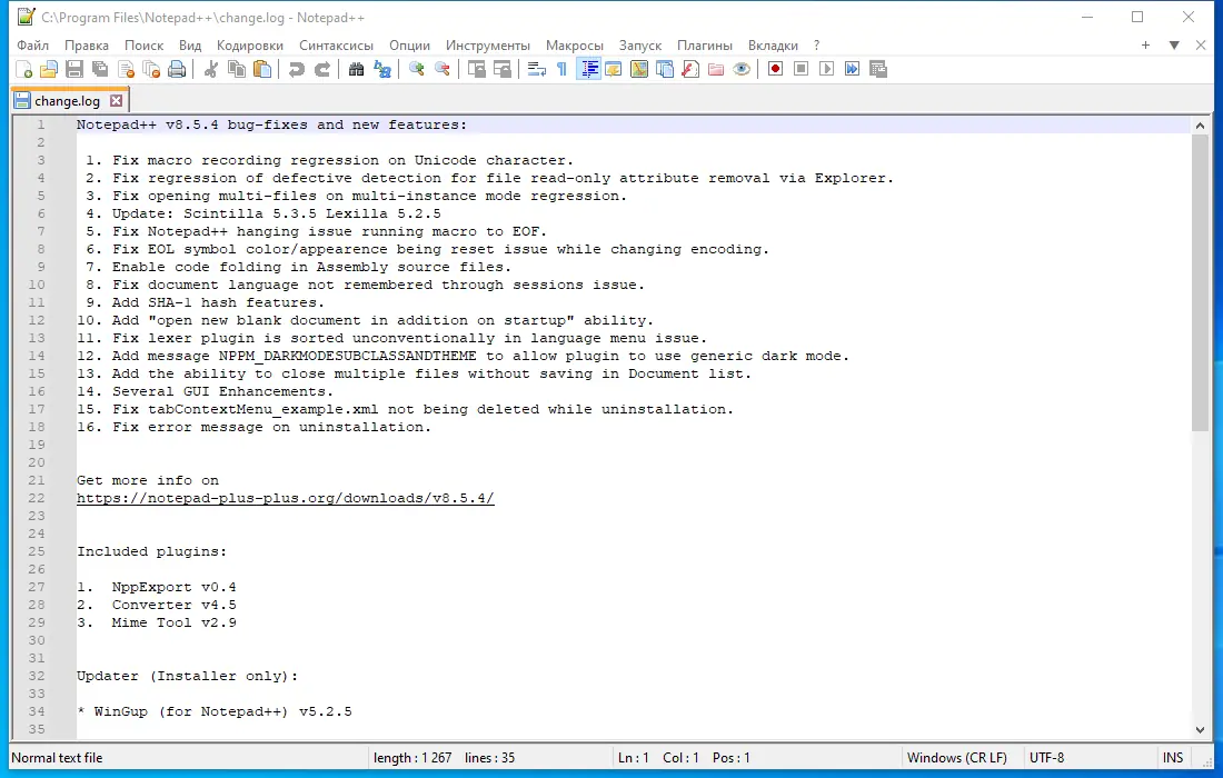 Версия 8.5.4 включает исправление ошибок и внедрение новых функций, таких как обновленная подсветка синтаксиса, поддержка SHA-1 хеширования, возможность открытия новых документов при запуске, улучшения интерфейса и исправления в работе с мультифайловым режимом. Также добавлены новые плагины и расширена совместимость с различными файлами и языками.