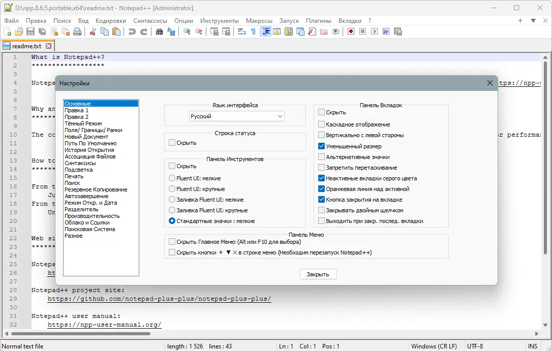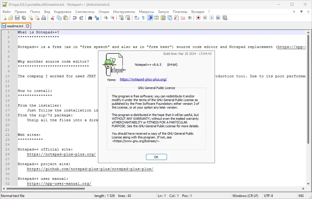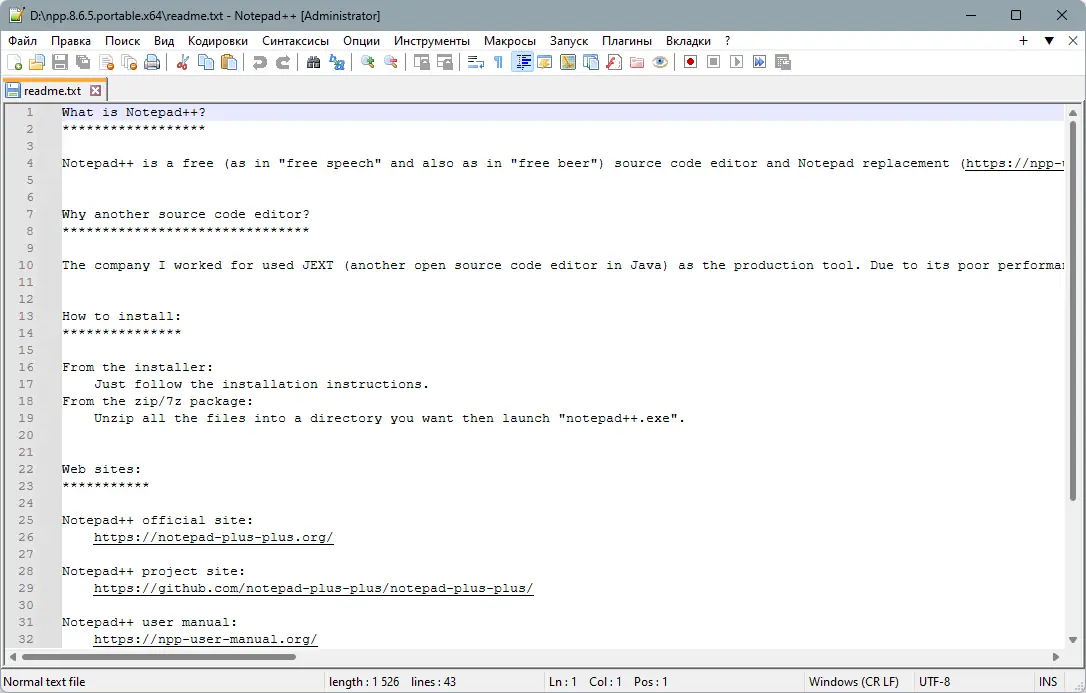 Notepad++ основан на компоненте Scintilla — высокоэффективном движке для редактирования, написанном на C++ с использованием Win32 API и STL, что обеспечивает быстрый отклик и минимальный размер программы. Этот редактор поддерживает синтаксис всевозможных языков программирования, обладает гибкими настройками подсветки и множеством функций для повышения эффективности работы. Программа распространяется под лицензией GPL, что делает ее доступной абсолютно бесплатно. она полностью совместима с операционными системами Windows 7, 8/8.1, 10 и 11 в версиях x32 и x64.
