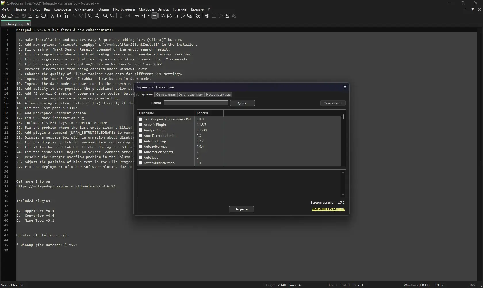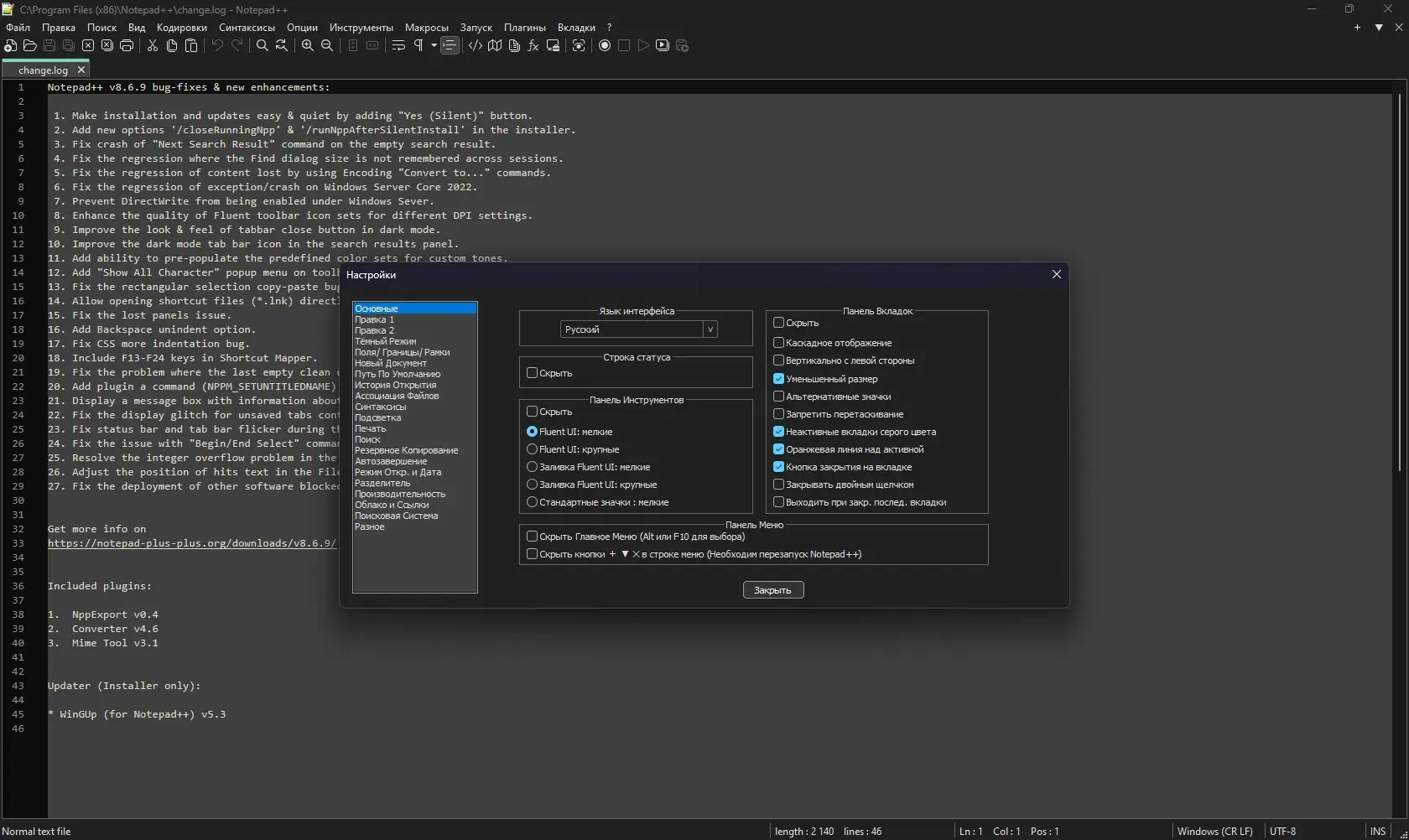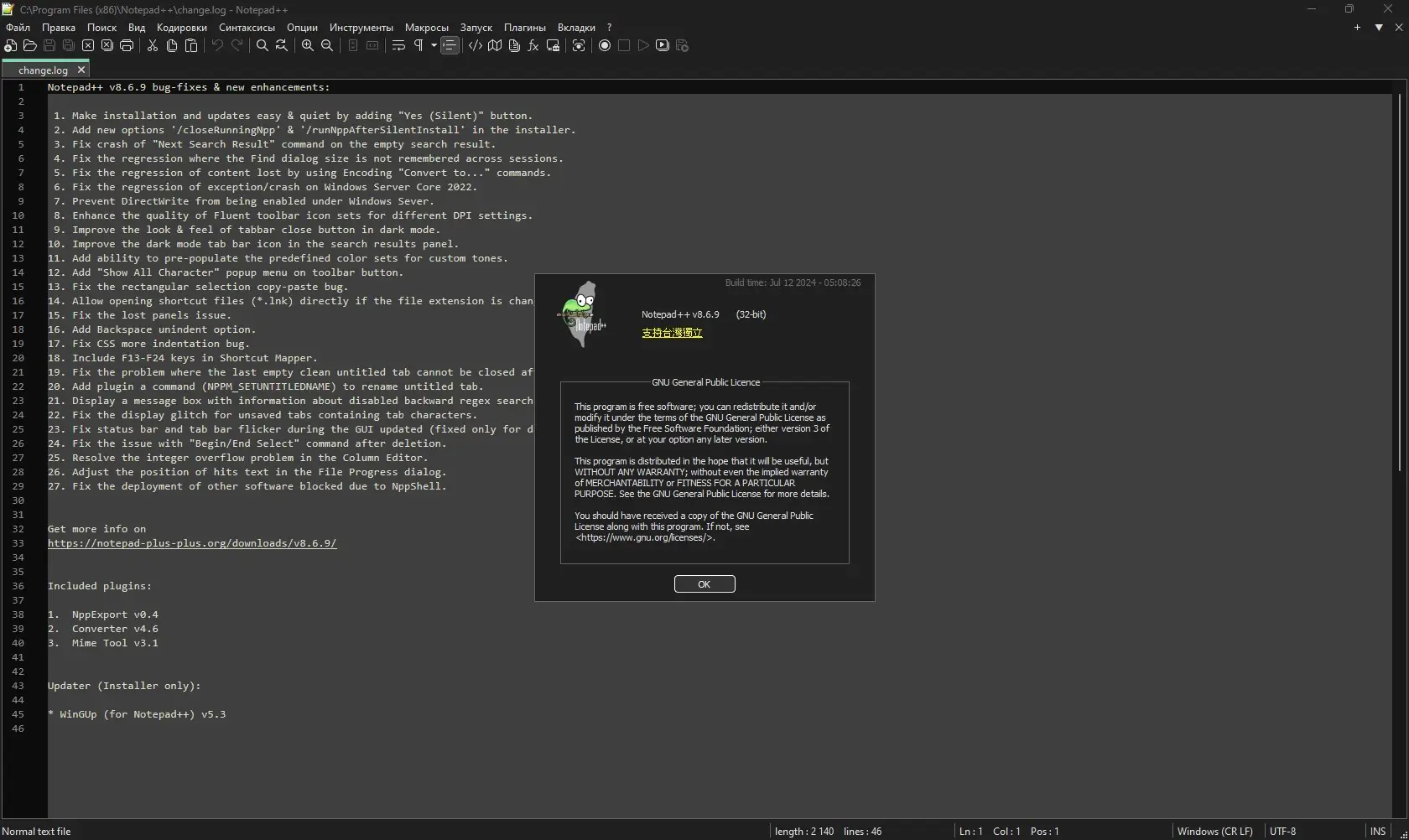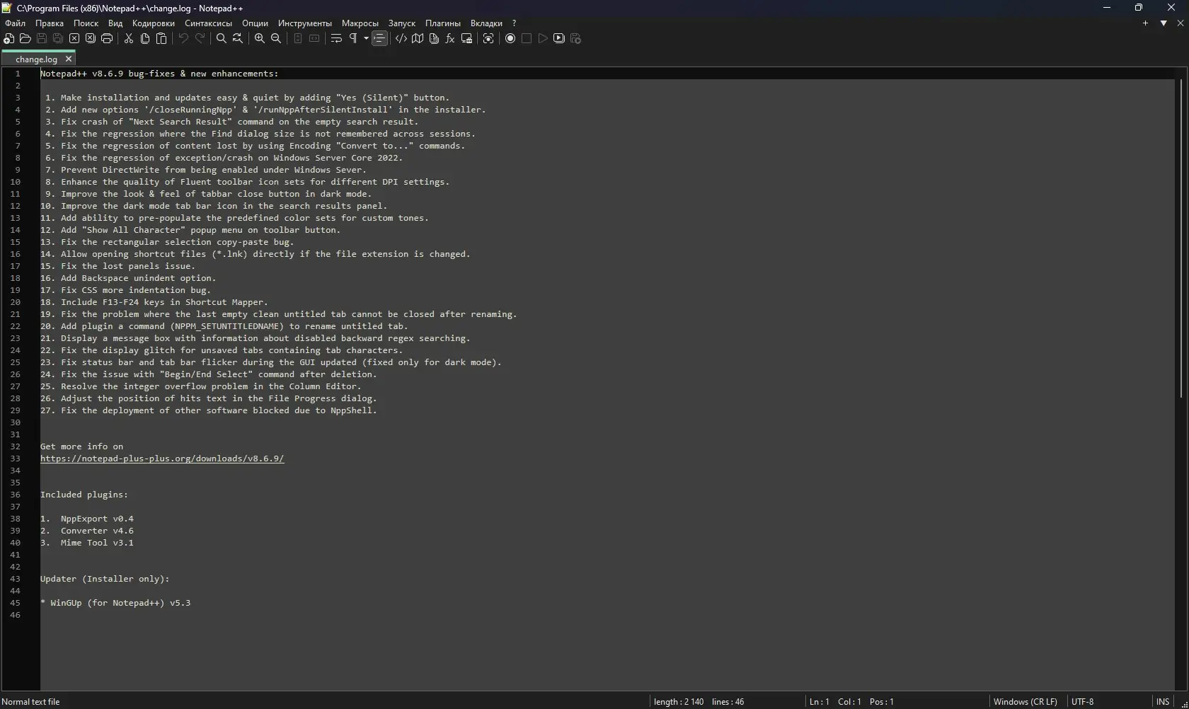 Обновленная версия включает улучшенную подсветку синтаксиса, повышенную производительность и расширенные возможности настройки интерфейса. Также реализованы новые инструменты для работы с регулярными выражениями и оптимизация работы с большими файлами.