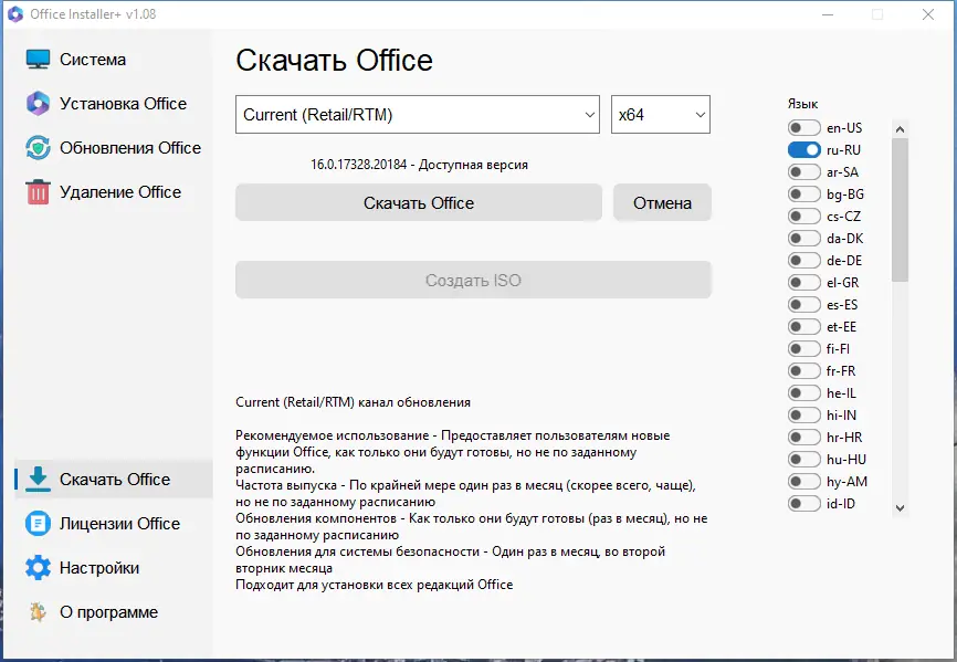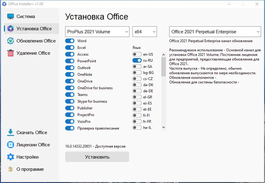 Office Installer позволяет пользователям осуществлять установку Microsoft Office различных версий и редакций как с подключением к интернету, так и без него. Возможна также подготовка индивидуальных дистрибутивов, что значительно упрощает многократную установку на нескольких устройствах. Программа обладает удобным интерфейсом, позволяющим легко управлять процессом и выбирать необходимые параметры установки.