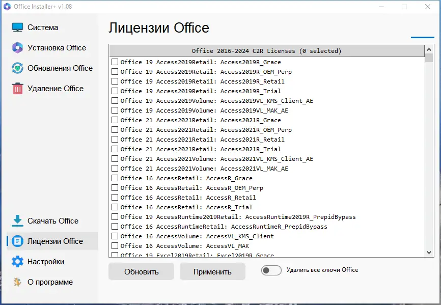 Благодаря наличию нескольких режимов работы, вы можете безопасно удалять старые версии Office, а затем производить активацию новых без необходимости обращения к службам Microsoft. Интеллектуальные функции позволяют создавать ISO-файлы, а также управлять лицензиями и ключами через встроенные инструменты.