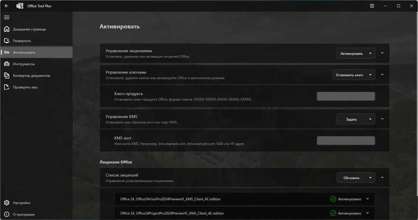 - Поддержка активации Office онлайн, по телефону и через KMS-серверы