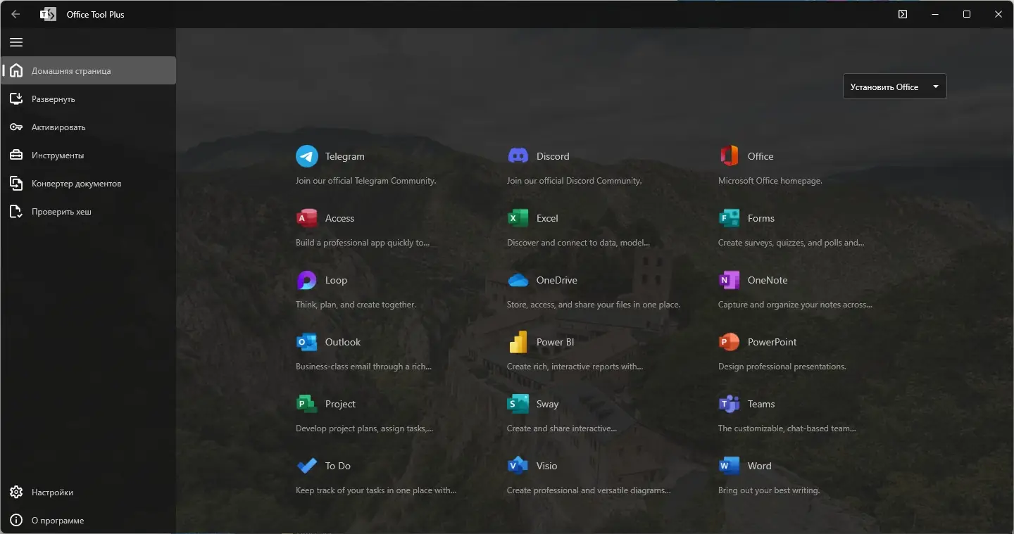 Office Tool Plus — мощное программное обеспечение для работы с офисными пакетами от компании Microsoft, предназначенное для упрощения установки, настройки и управления продуктами Office и связанными приложениями. Интуитивно понятный интерфейс и широкий функционал позволяют пользователям легко модифицировать существующие установки, создавать индивидуальные профили и управлять активацией.