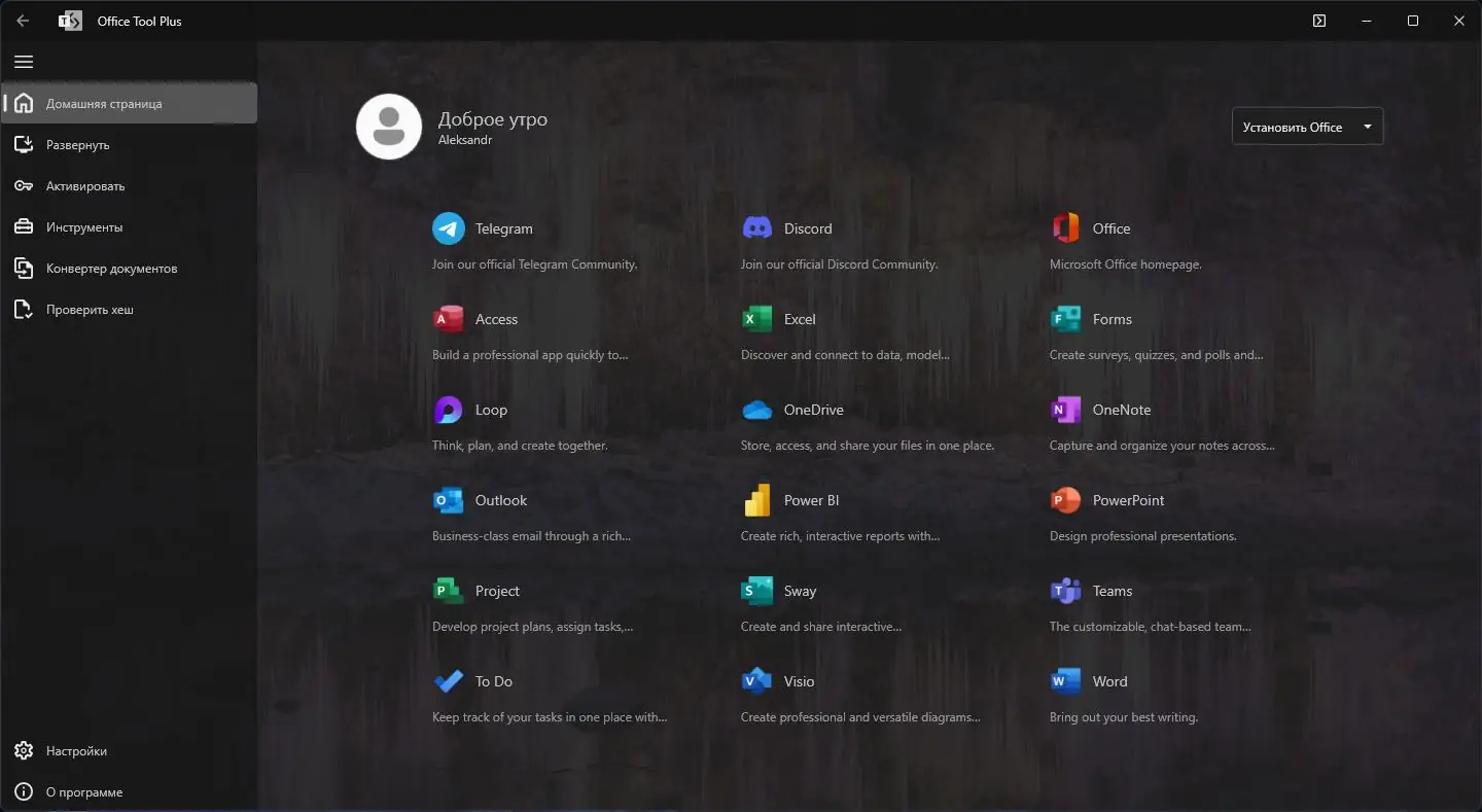 Office Tool Plus — это мощное и многофункциональное приложение для работы с офисными продуктами от компании Microsoft. Оно предоставляет пользователю возможность легко управлять установкой и настройкой офисного программного обеспечения, модернизировать существующие версии, изменять каналы обновлений, удалять ненужные языковые пакеты и в полном объеме контролировать процесс активации. Благодаря стильному интерфейсу и логическому разделению функций, создать индивидуальный профиль установки и быстро развернуть необходимые компоненты на других устройствах становится максимально просто и удобно.