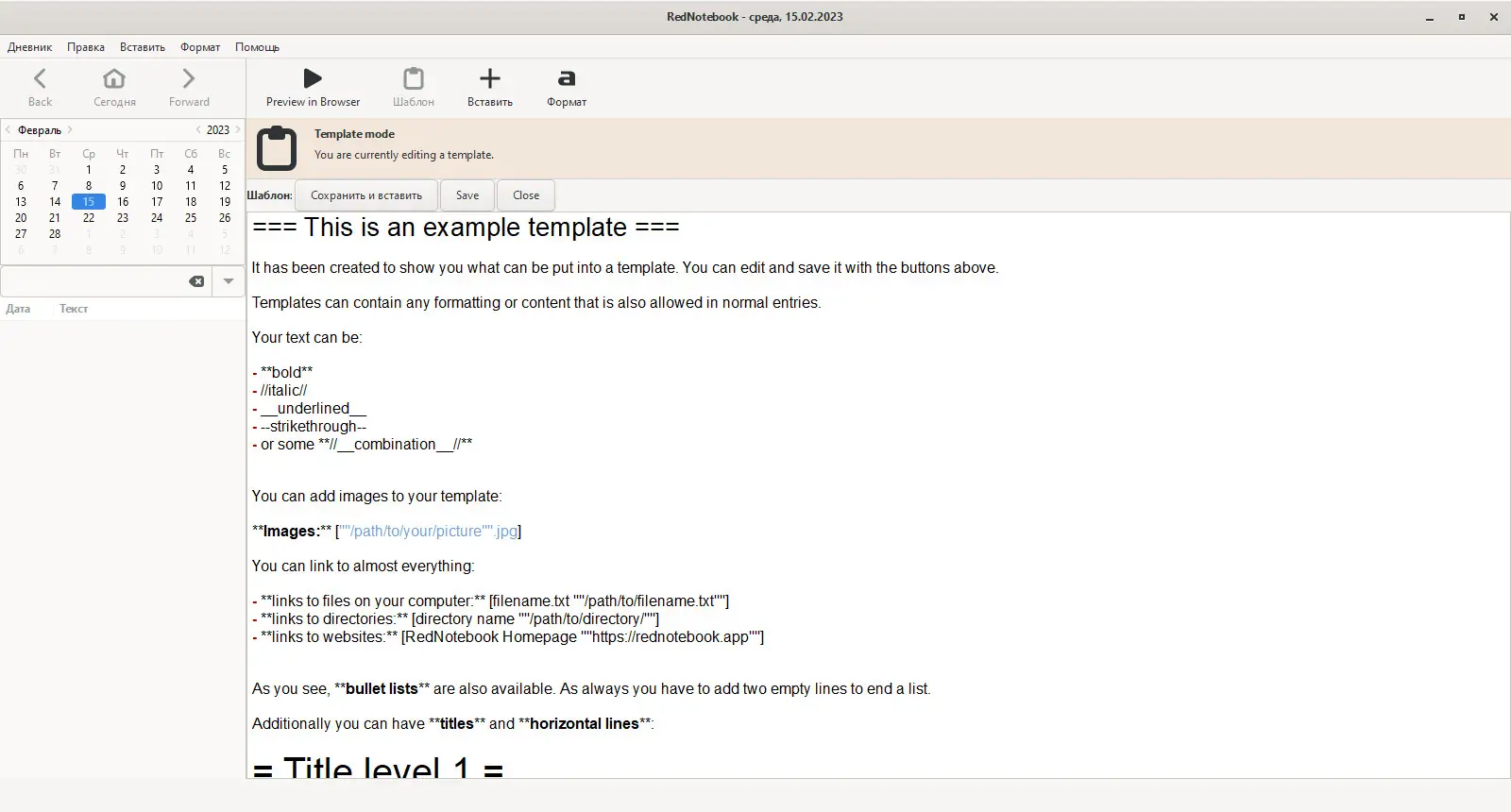 RedNotebook представляет собой интуитивный инструмент для организации личных записей. Он обладает приятным и минималистичным интерфейсом, что делает его легким в использовании и настройке. Программа функционирует в двух режимах: редактирования и просмотра. В режиме редактирования пользователь может добавлять новые заметки или редактировать существующие, а в режиме просмотра — просматривать записи в удобной форме. Основной функционал включает базовые возможности текстового редактора и автоматическое создание облака тегов, которое помогает быстро находить нужные записи по ключевым словам. Благодаря встроенной навигации по календарю и поддержке шаблонов, работа с дневником становится организованной и комфортной.