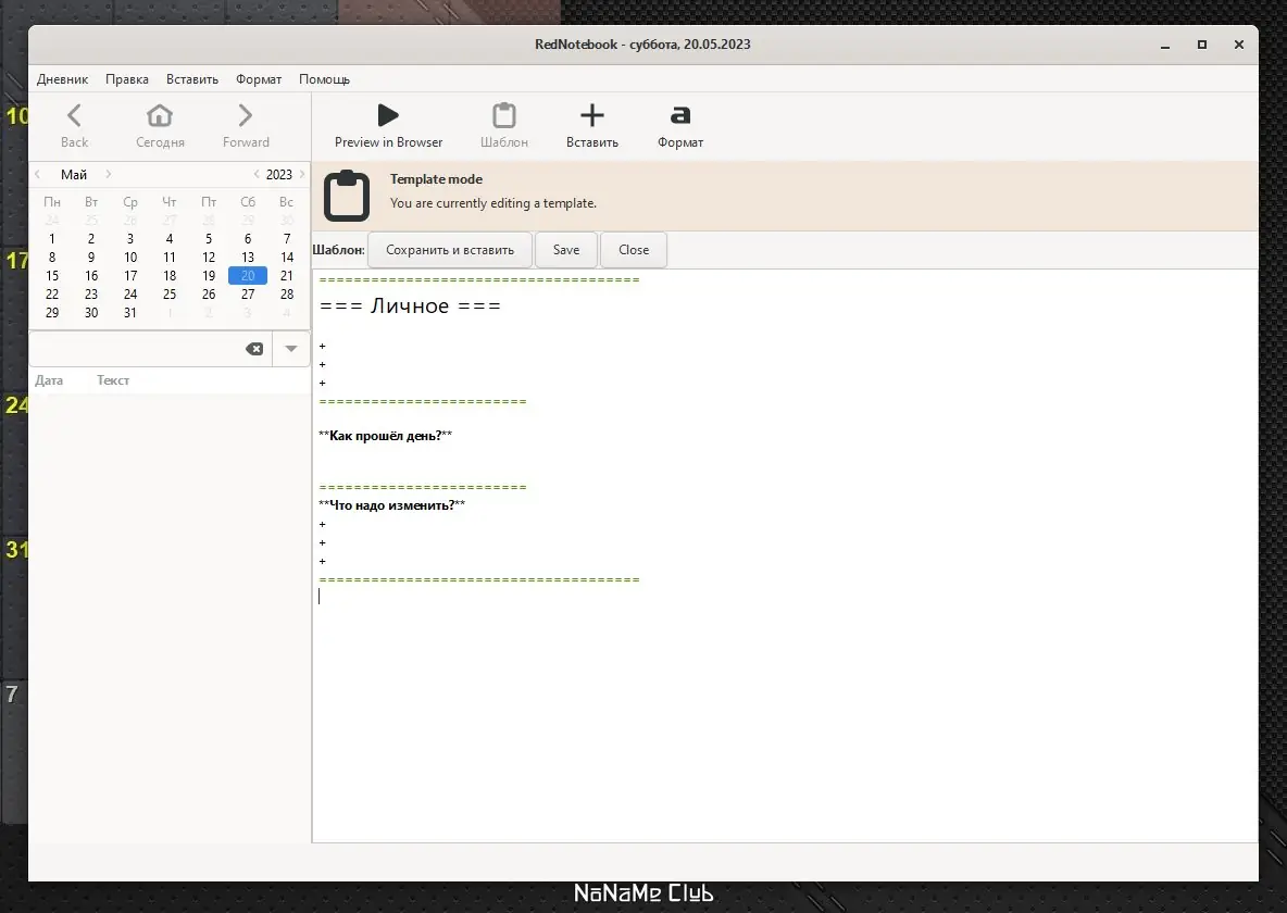 RedNotebook представляет собой легкий в использовании личный дневник с минималистичным, приятным интерфейсом и широкими возможностями для организации информации. Он работает в двух режимах: редактирования и просмотра. В режиме редактирования пользователь может создавать новые записи, редактировать существующие, вставлять ссылки, изображения и использовать шаблоны для ускорения оформления. В режиме просмотра осуществляется быстрый доступ к ранее сохранённым записям, а благодаря облаку тегов и календарю навигация становится максимально удобной.