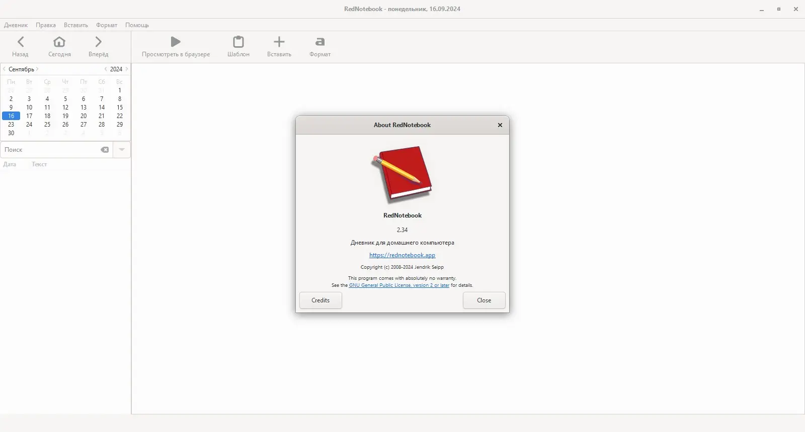 RedNotebook — это простое в использовании приложение для ведения личных заметок и дневника, написанное на Python с использованием GTK+ / Gnome. Оно подходит для структурирования мыслей, событий и действий, позволяя легко сохранять и находить записи благодаря автоматическому созданию облака тегов и интегрированному календарю.