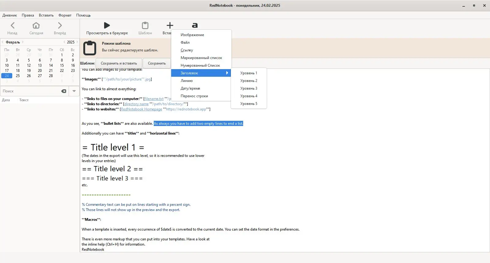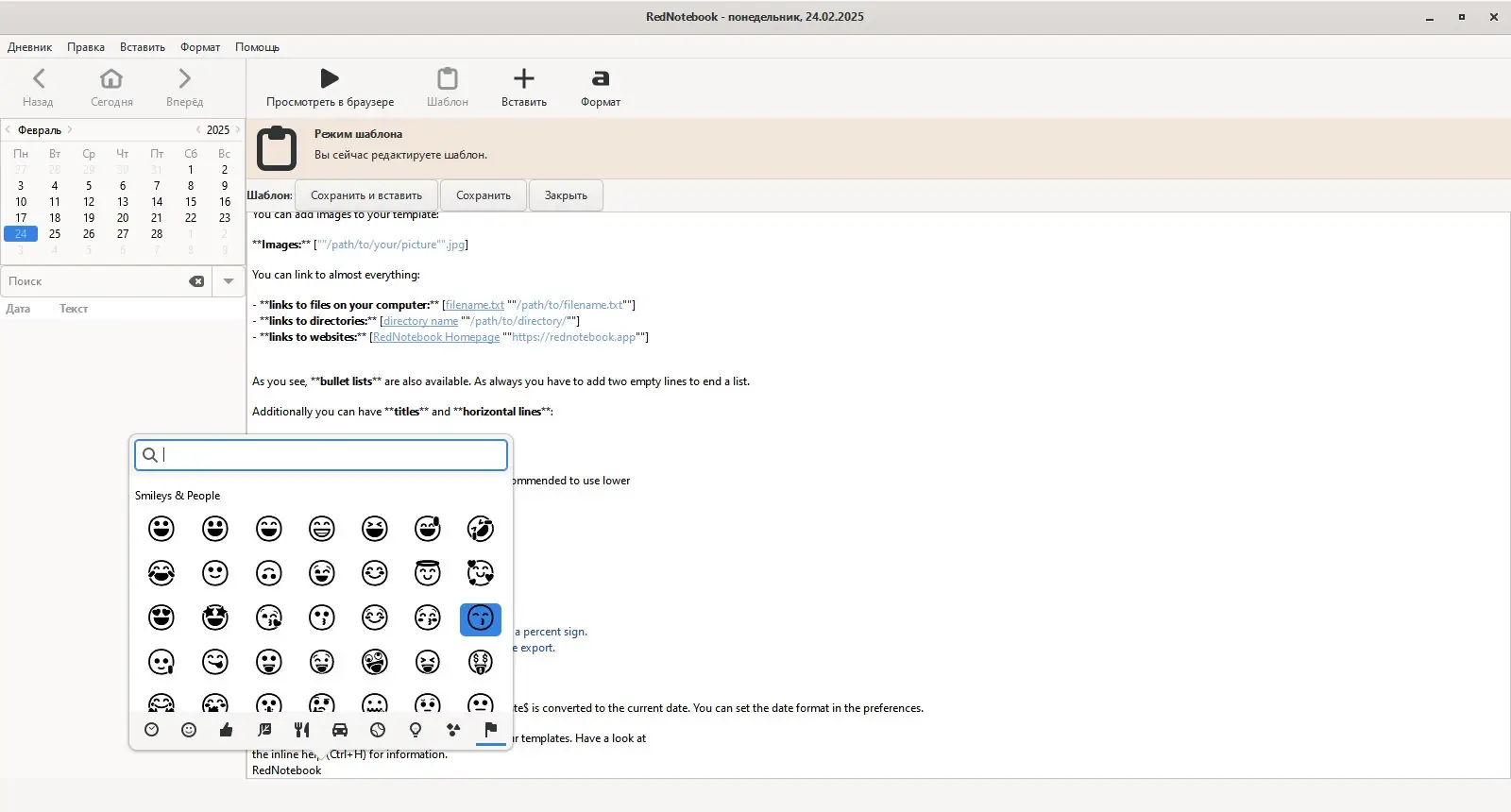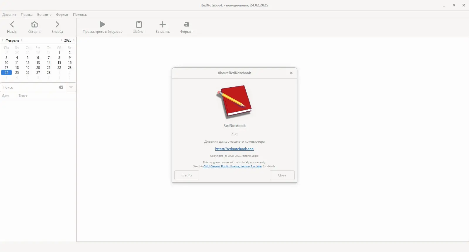 RedNotebook — это простое и удобное приложение для ведения личного дневника, разработанное с использованием GTK+ / Gnome и написанное на Python. Оно предназначено для хранения мыслей, событий и задач в современном и наглядном интерфейсе, что делает его идеальным инструментом для упорядочивания личной информации.