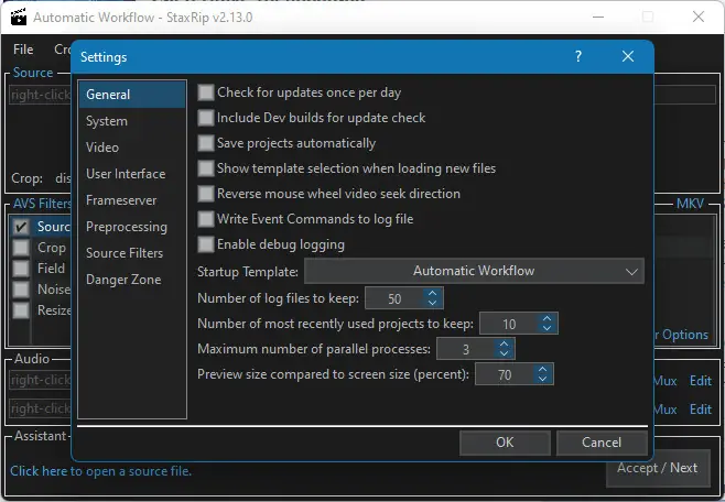 - При необходимости выполните настройку предпочтительных параметров кодирования в меню программы.