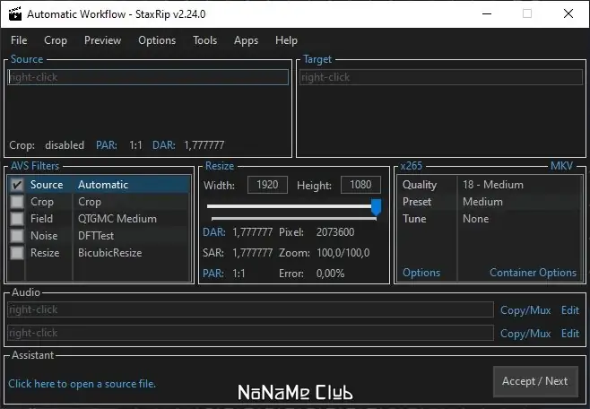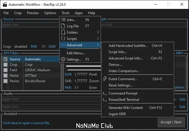 StaxRip — универсальный инструмент для высококачественного кодирования видео, предназначенный для преобразования различных видеоформатов (Blu-ray, DVD, DVB и другие) в популярные контейнеры и кодеки, такие как DivX, XviD, H.265 и H.264. Встроенные функции позволяют работать с широким спектром видеографиков (XviD, x264/H264/AVC, x265/H265/HEVC, VP9, AVI, MP4, MKV, WEBM), а также аудиоформатами (MP3, AC3, AAC, DTS, WAV и др.). Работа с видео осуществляется через поддержку AviSynth+ и VapourSynth, а аппаратное ускорение доступно для процессоров AMD, Intel и видеокарт NVIDIA, что обеспечивает быстрое и эффективное кодирование. В программе реализованы возможности для автоматической обработки и пакетных сценариев, автоматическое обновление, автоматизация настроек и расширенные инструменты для редактирования и резки видео. Помимо кодирования, есть возможность создавать короткие высококачественные анимации в форматах gif и aPNG, а также поддерживаются субтитры и разные профили для мобильных устройств и игровых консолей.