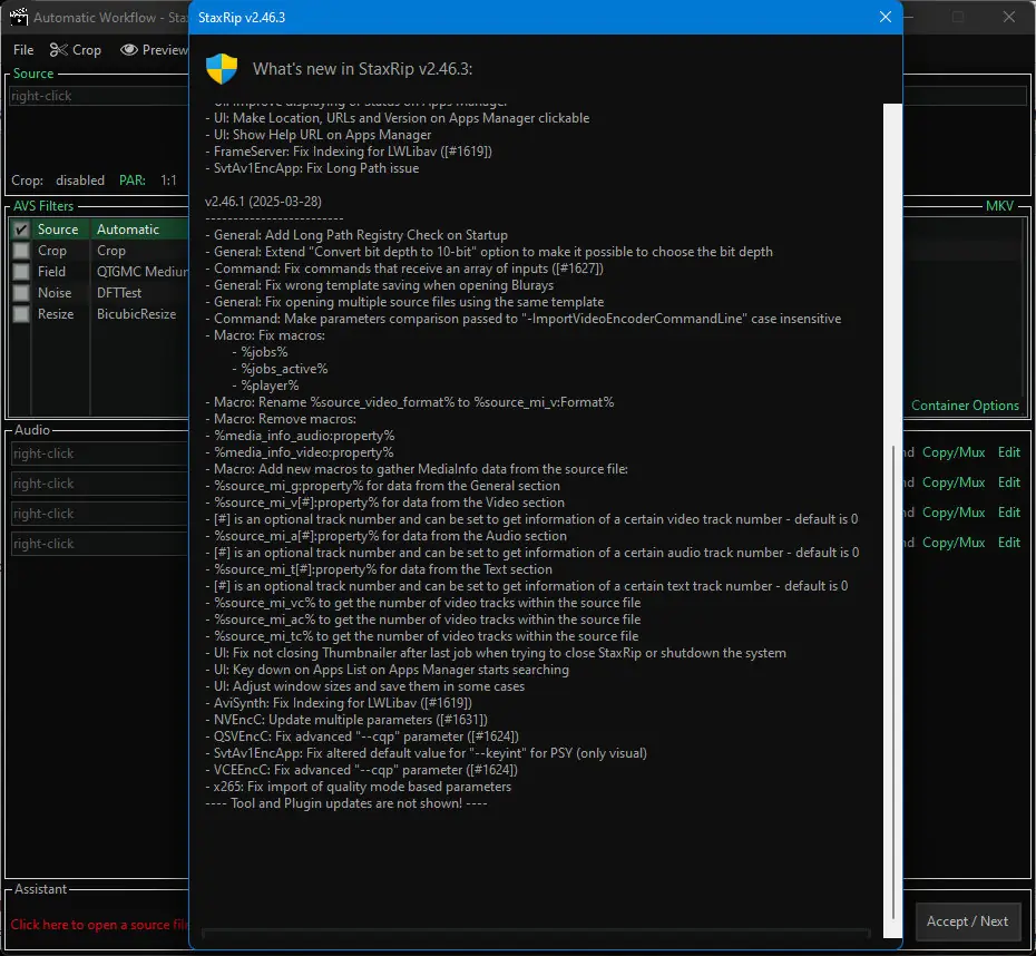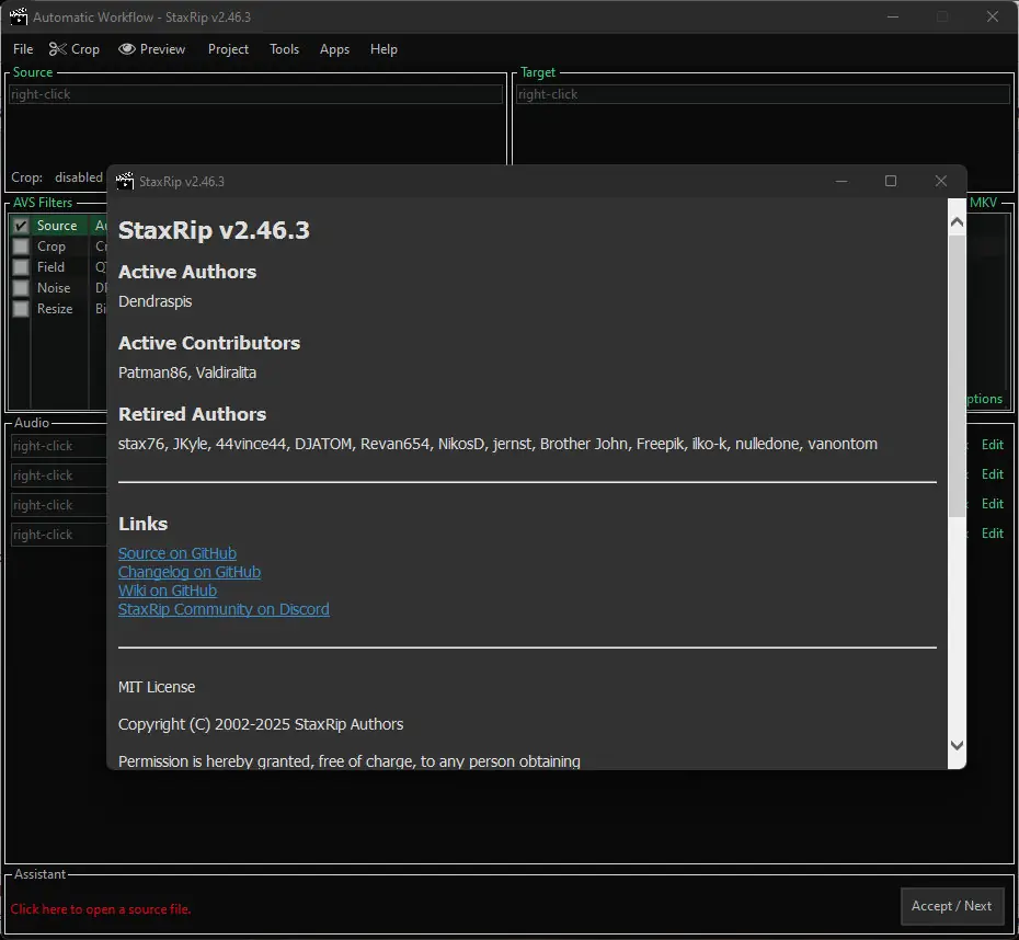 StaxRip — универсальный инструмент для видеокодирования, объединяющий в себе все необходимые функции для преобразования видео с различных носителей. Он предназначен для преобразования Blu-ray, DVD, DVB и других форматов в популярные видео и аудиоформаты, такие как DivX, XviD, H.265, H.264, MP4, MKV, WEBM, а также обеспечивает поддержку различных аудиоформатов. Плагинная архитектура и встроенные редакторы позволяют гибко работать с видео- и аудиоданными, а также обеспечивают аппаратное ускорение кодирования для AMD, Intel и NVIDIA, что значительно ускоряет процесс обработки.