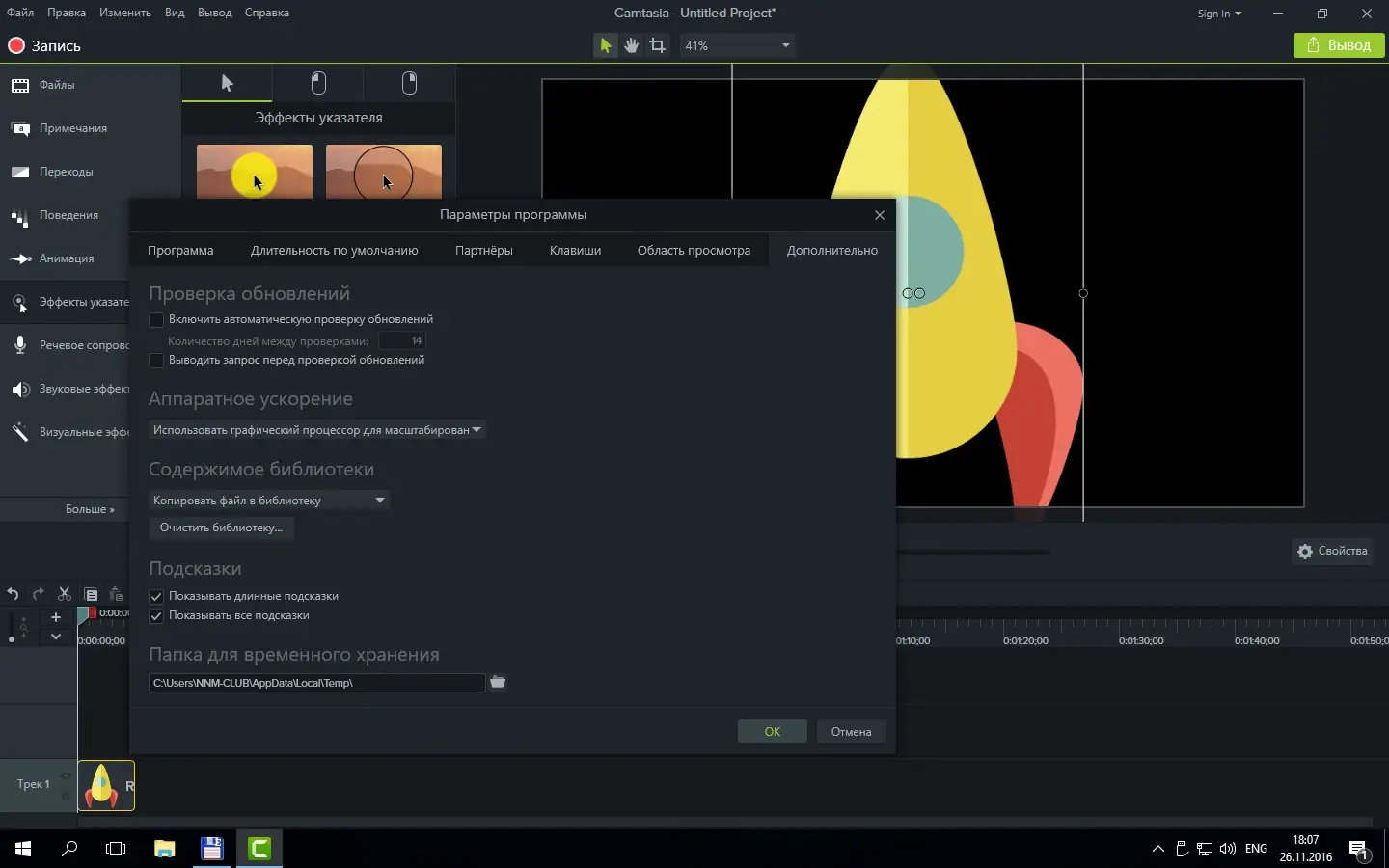 - Оптимизация видео с помощью фирменного кодека TechSmith Screen Capture Codec (TSCC) для достижения высокой сжатости и качества