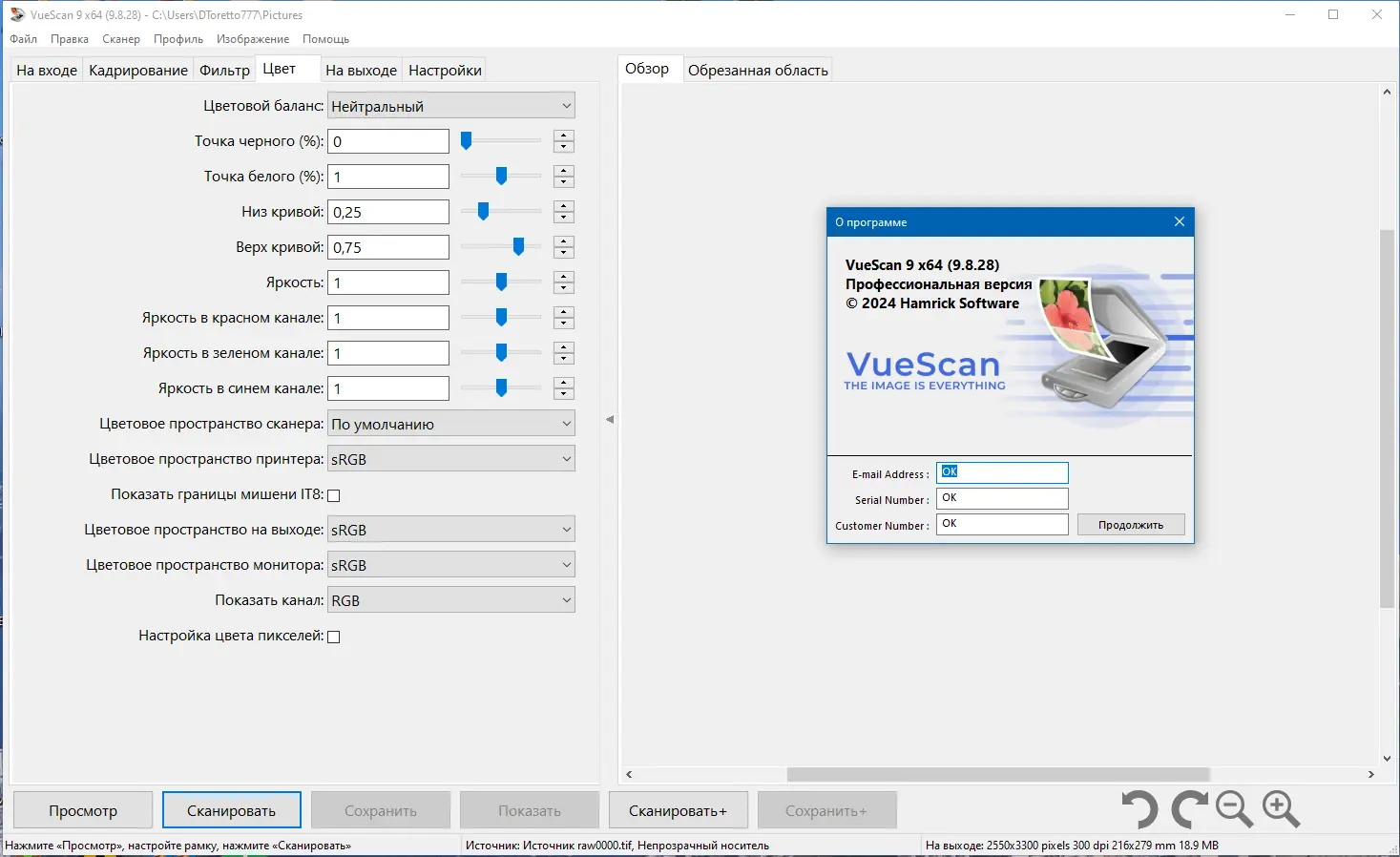 Программа позволяет настраивать глубину цвета, регулировать экспозицию аппаратным способом, осуществлять многопроходное и пакетное сканирование, а также сохранять исходные данные изображений в RAW-файл для последующей обработки. Дополнительно, VueScan поддерживает ICC-профили и цветовые пространства, что облегчает работу с профессиональными цветовыми настройками, включая калибровку IT8.