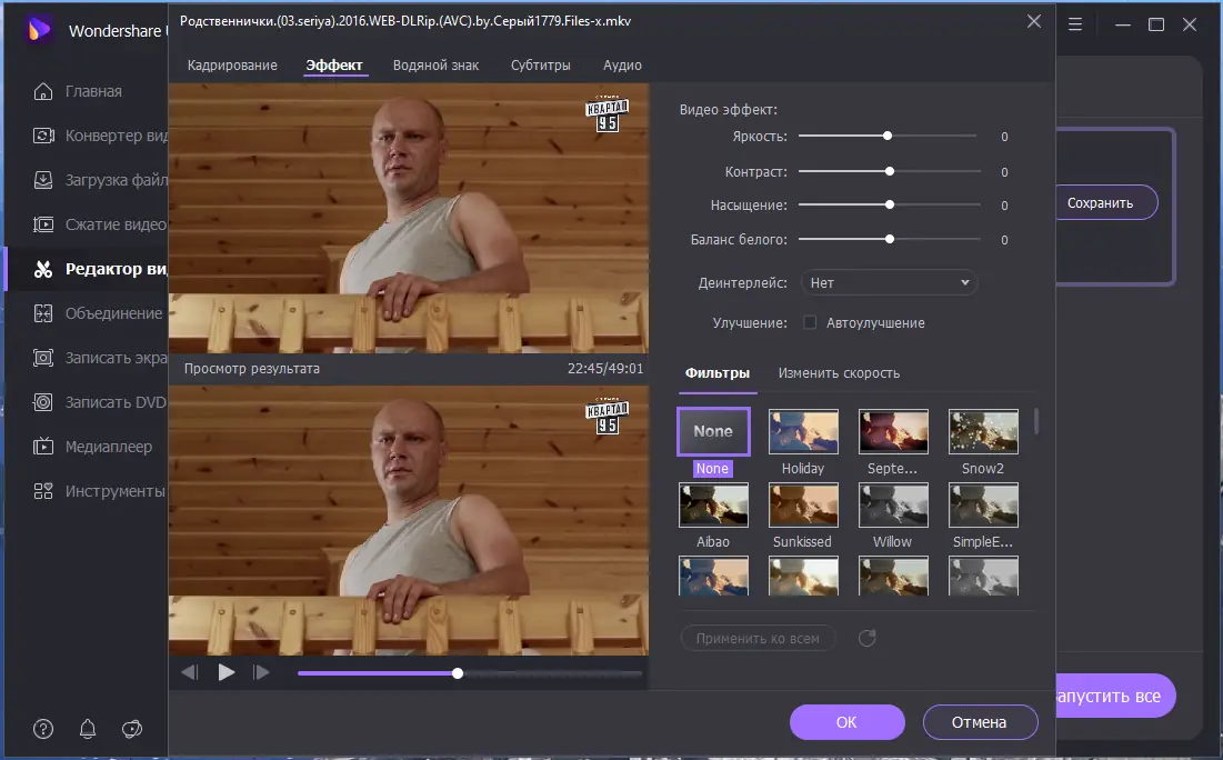 - Редактирование видео: обрезка, объединение, поворот, добавление водяных знаков и субтитров, настройка цветовых параметров