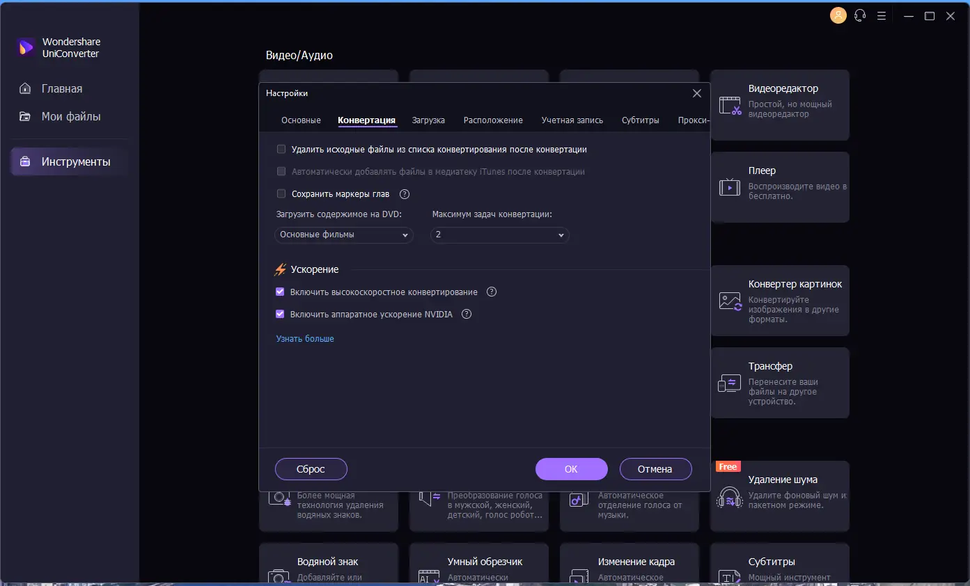 Wondershare UniConverter — мощная программа для видеоконвертации, редактирования и управления мультимедийными файлами, которая сочетает простоту использования с расширенным функционалом.