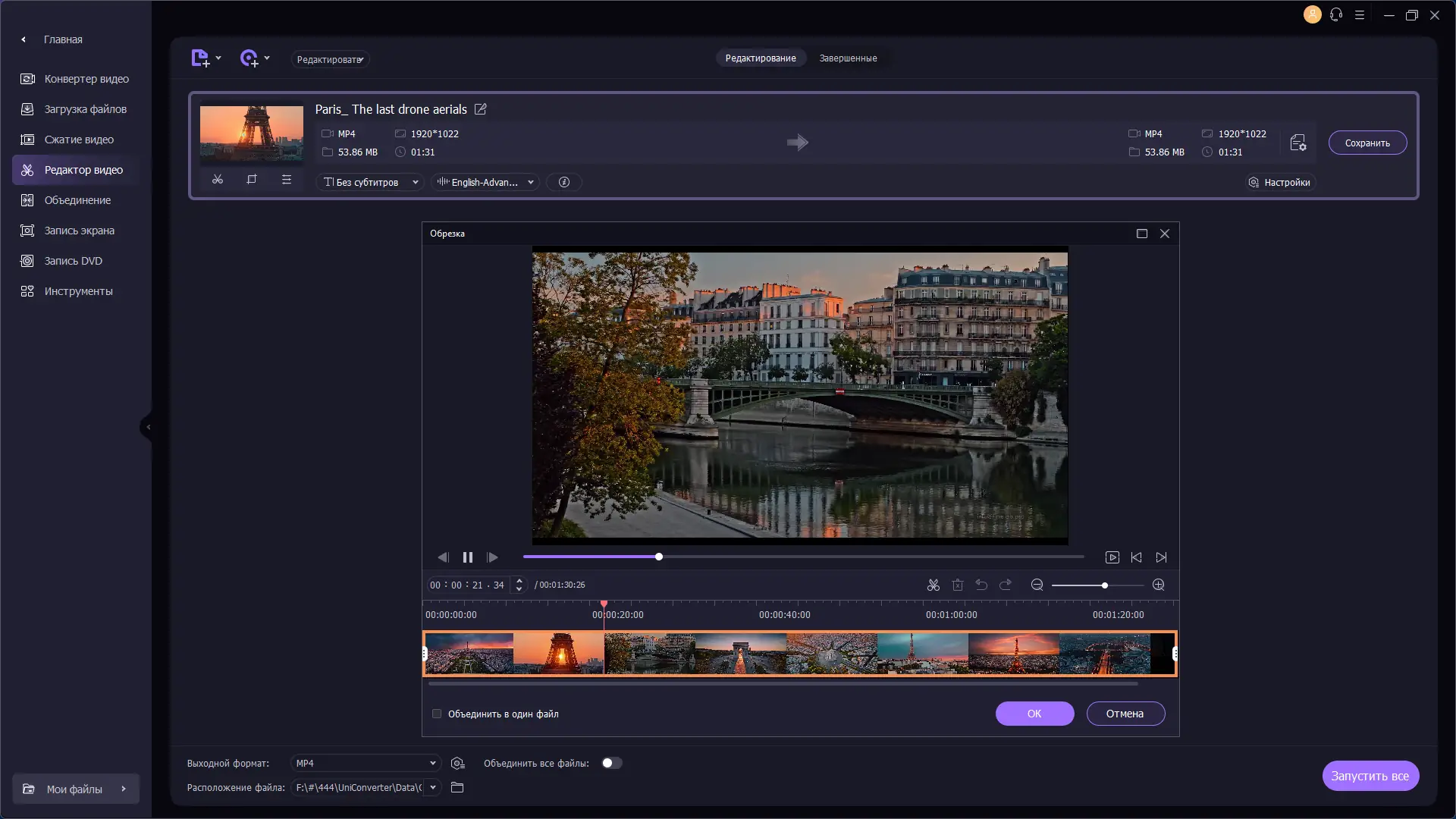 - Редактирование видео: обрезка, объединение, поворот, добавление водяных знаков, субтитров и эффектов